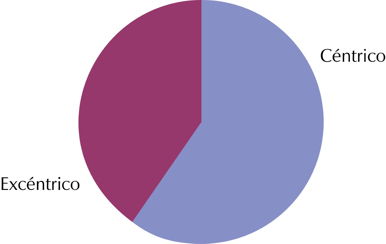 En la distribución porcentual, de acuerdo a la clasificación de bruxismo, se destacó el bruxismo céntrico con 55.55 y el bruxismo excéntrico con 44.44% (Figura 3). Según el tipo de bruxismo es la afectación ósea. El excéntrico desarrolla condensación ósea y exostosis, en cambio el céntrico ocasiona resorción ósea y consecuentemente movilidad dental.12