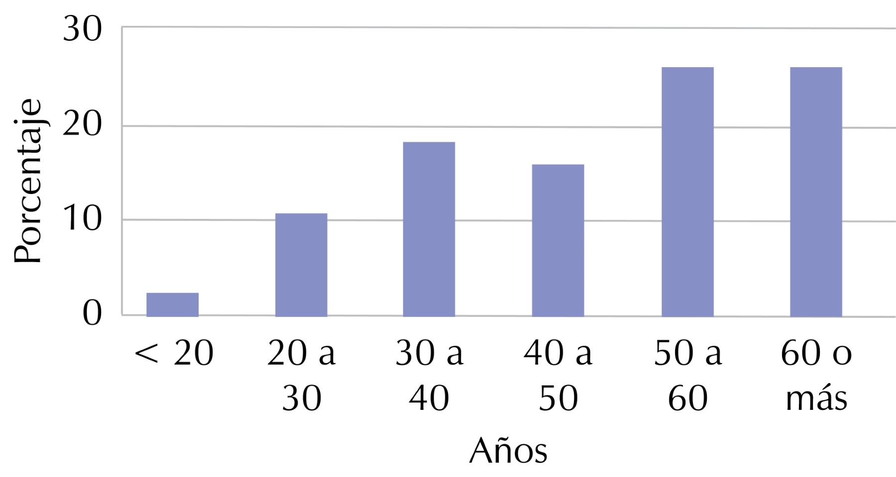 El predominio fue de 25.92% de estrés en una población entre los 50 a 60 años o más (Figura 4). El distanciamiento social tuvo efectos en esta población de pacientes, debido a la indicación de quedarse en casa, pues como la mayoría no tenía afinidad a la tecnología, ni contacto con su familia, hubo predominio de la ansiedad y el estrés en ellos.