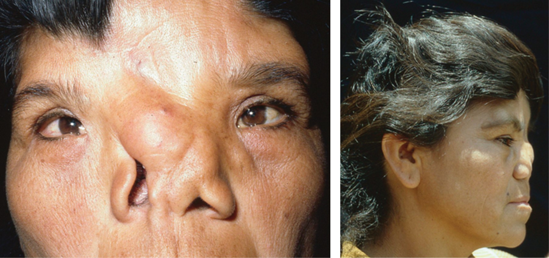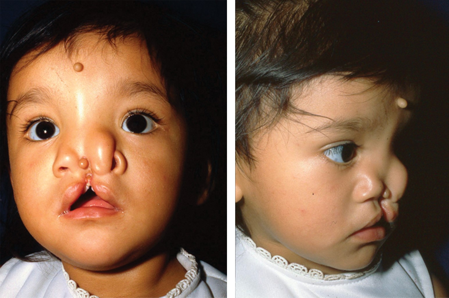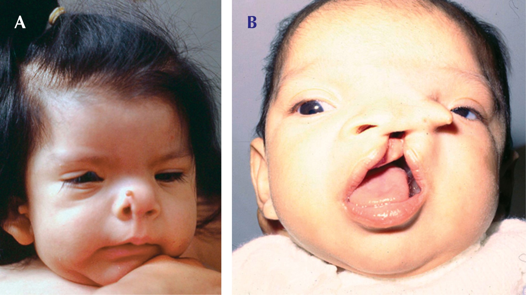 O bien, en casos más severos puede observarse una hendidura facial media que afecta a la nariz en toda su longitud, y que frecuentemente se continúa al labio superior y paladar duro. Clínicamente la nariz se aprecia aplanada, con las fosas nasales muy espaciadas entre sí o con muescas de una o ambas alas nasales. Asimismo, es posible encontrar hipoplasia de las alas de la nariz, una notable hipoplasia nasomaxilar, con un ángulo nasolabial plano y ausencia de espina nasal anterior.7,8