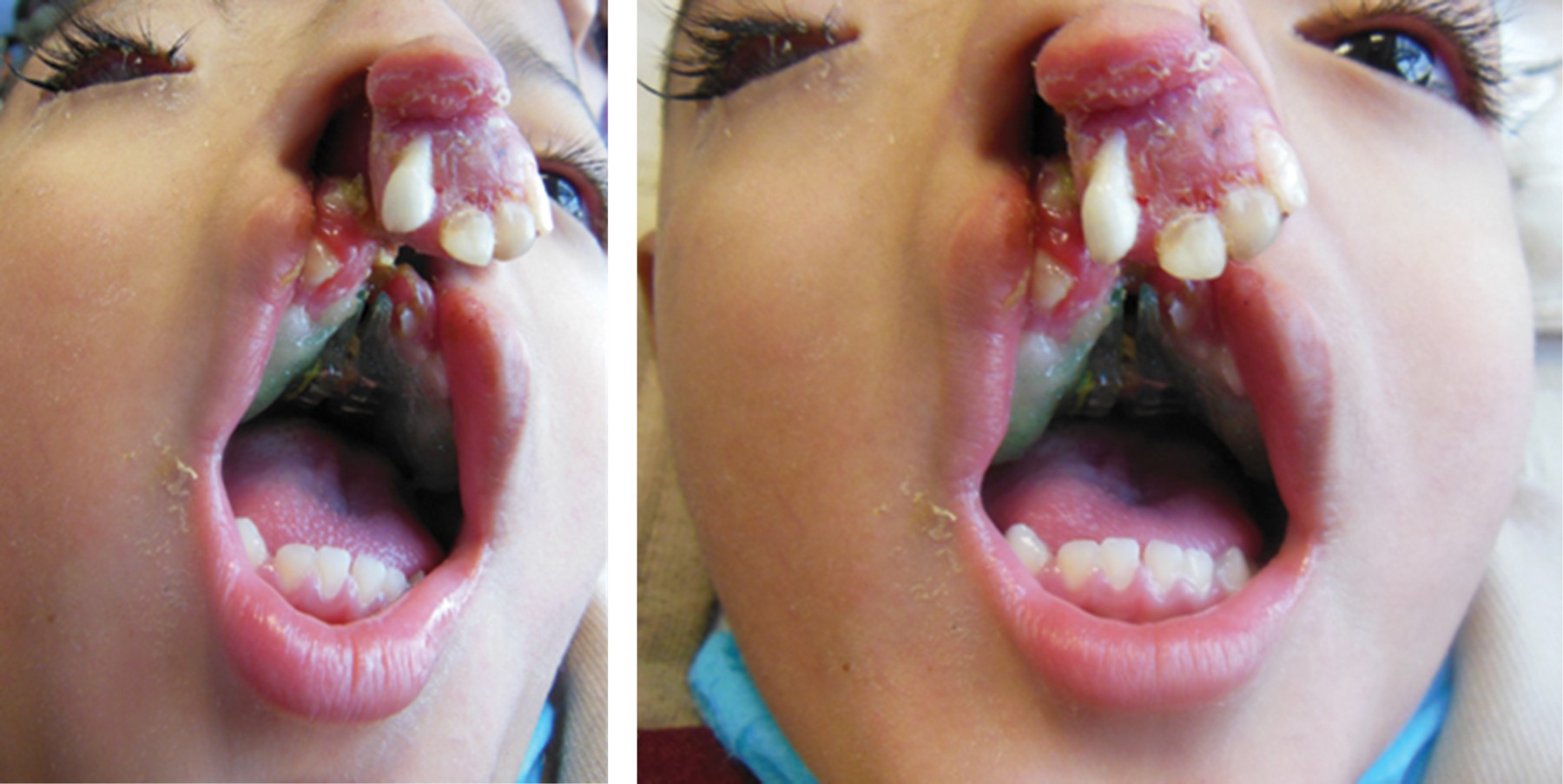 Resulta importante destacar que, si la hendidura labial involucra al paladar primario, puede traer consigo malposiciones dentales como giroversiones y problemas en el crecimiento maxilofacial que mimeticen una clase III, por el aplanamiento del perfil y la hipoplasia nasomaxilar mencionadas con anterioridad (Figura 5).