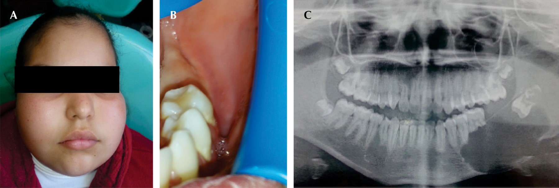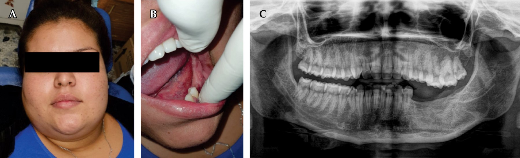 Paciente femenino de 11 años de edad que acudió a consulta en el Departamento de Cirugía Maxilofacial del Hospital Infantil de Morelia, fue referida por el Servicio de Urgencias del mismo nosocomio (Figura 1). Estaba acompañada por su tutora, quien dijo haber notado un incremento de volumen en el cuerpo de la mandíbula de la paciente, del lado izquierdo y que comenzó hacía seis años, por lo que fue tratada de múltiples maneras sin resultados favorables; pero debido a que el incremento era constante, acudieron al hospital. La paciente indicó que se trataba de una lesión asintomática y que únicamente cuando masticaba presentaba una ligera molestia. Además, no tenía antecedentes de importancia para su padecimiento.
