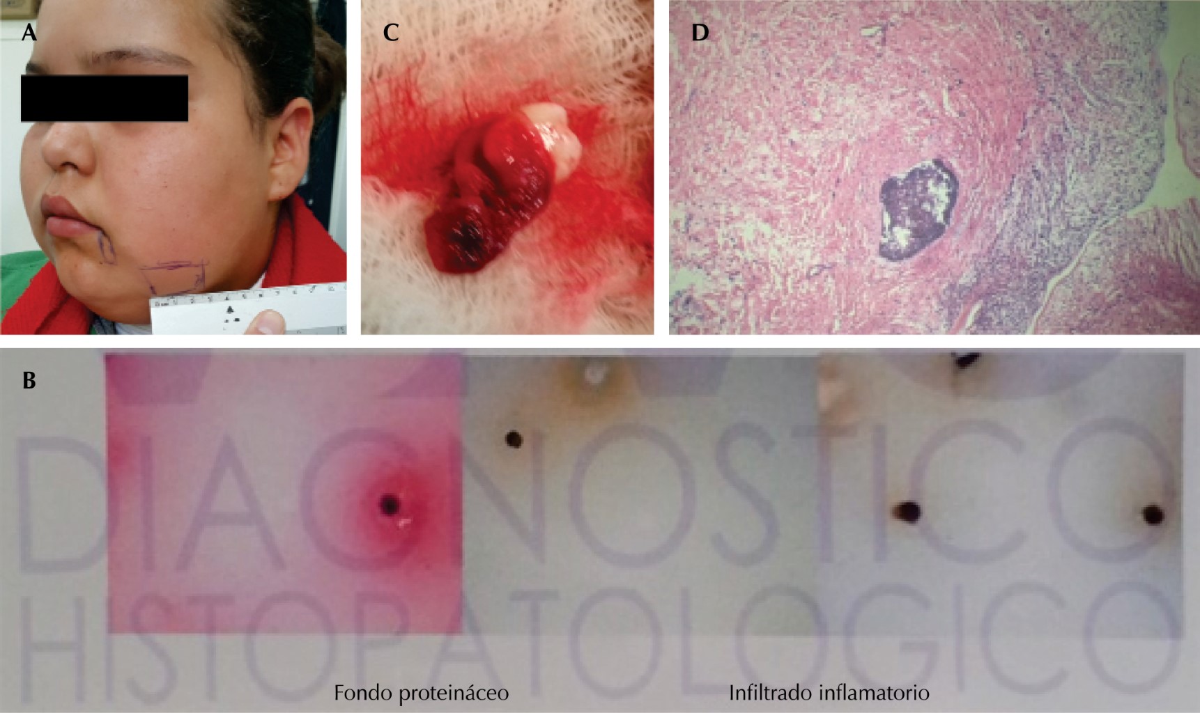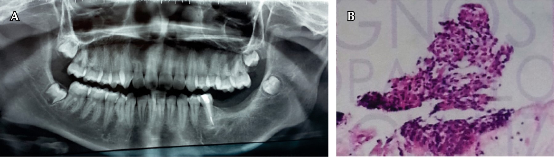 Los resultados de histopatología revelaron que el contenido líquido era de aspecto amarillo y turbio, se tiño con Papanicolaou, así como una hematoxilina y eosina para su interpretación y diagnóstico citológico, de donde se obtuvo como resultado "compatible con contenido de quiste de mandibular" y "alteraciones inflamatorias de tipo crónico en liquido quiste" (Figura 2). La citoquímica, antes de la centrifugación de líquido, demostró un aspecto hemorrágico y bacterioscópico negativo.