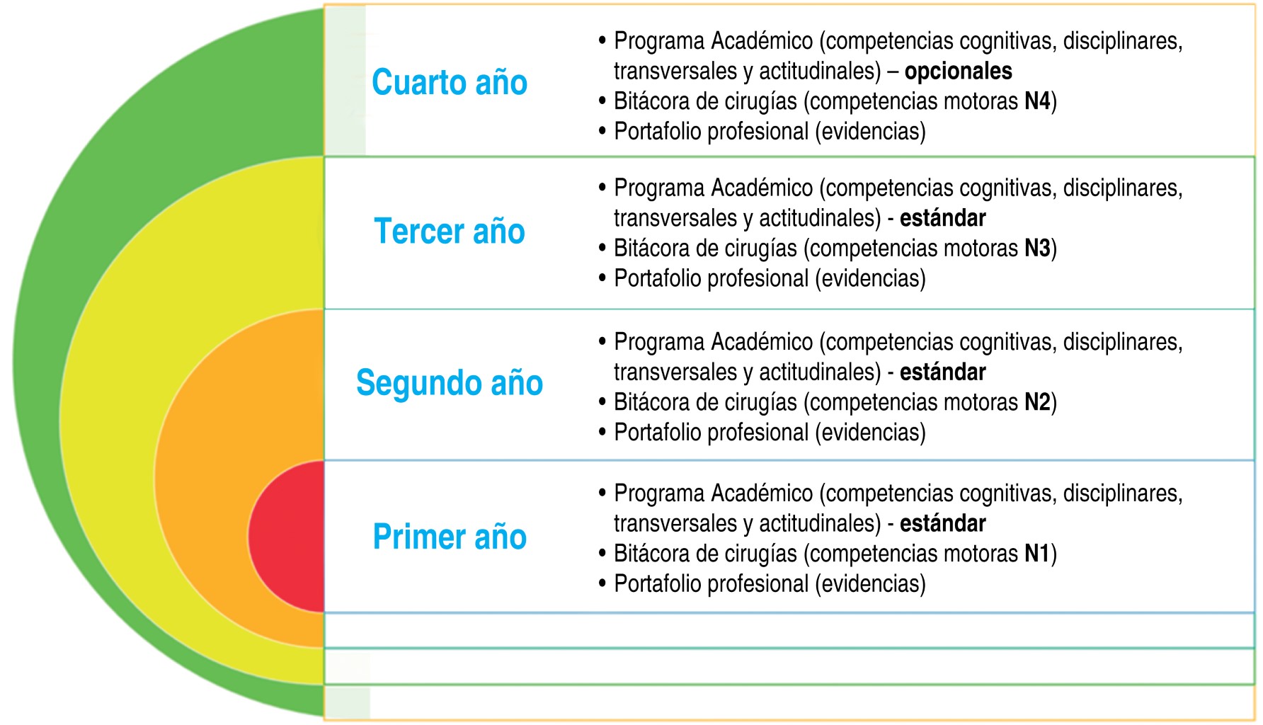 En la fase 1 se integraron cuatro competencias básicas (cognitivas/conocimientos teóricos; disciplinares/rotaciones; motoras/procedimentales; transversales y actitudinales) y un portafolio profesional (que contiene las evidencias de las competencias adquiridas en diferentes niveles de dominio) en un programa académico escolarizado en un calendario de cuatro años. La Figura 1 muestra la distribución general de un programa estándar de tres años y "flexible" en el último cuarto año. Tanto las competencias cognitivas como procedimentales o motoras fueron clasificada de acuerdo con el grado de dificultad o categoría de Bloom para la era digital.
