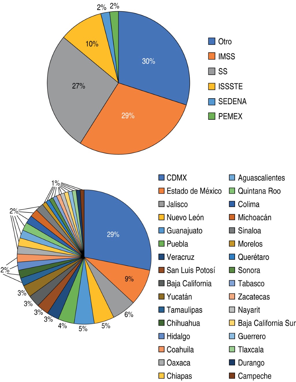En la fase 2, 204 profesores y jefes de enseñanza contestaron la encuesta. En esta misma fase también se mandó la encuesta a todos los asociados, aproximadamente 770 contestaron la encuesta. La representatividad federal y por sector de atención para la salud que contestaron la encuesta se muestra en la Figura 2. Esta representatividad federal consistió en 619 individuos (80.38%) que sí contestaron esta pregunta. Como se puede observar en la Figura 2, la mayor parte de los cirujanos encuestados que contestaron son de la CDMX, seguidos por el Estado de México, Jalisco, Nuevo León y Guanajuato. El resto de los estados estuvo representado por 5% o menos del total. Como también se puede observar en esta misma figura, todos los sectores de salud más importantes del país estuvieron representados en la encuesta.