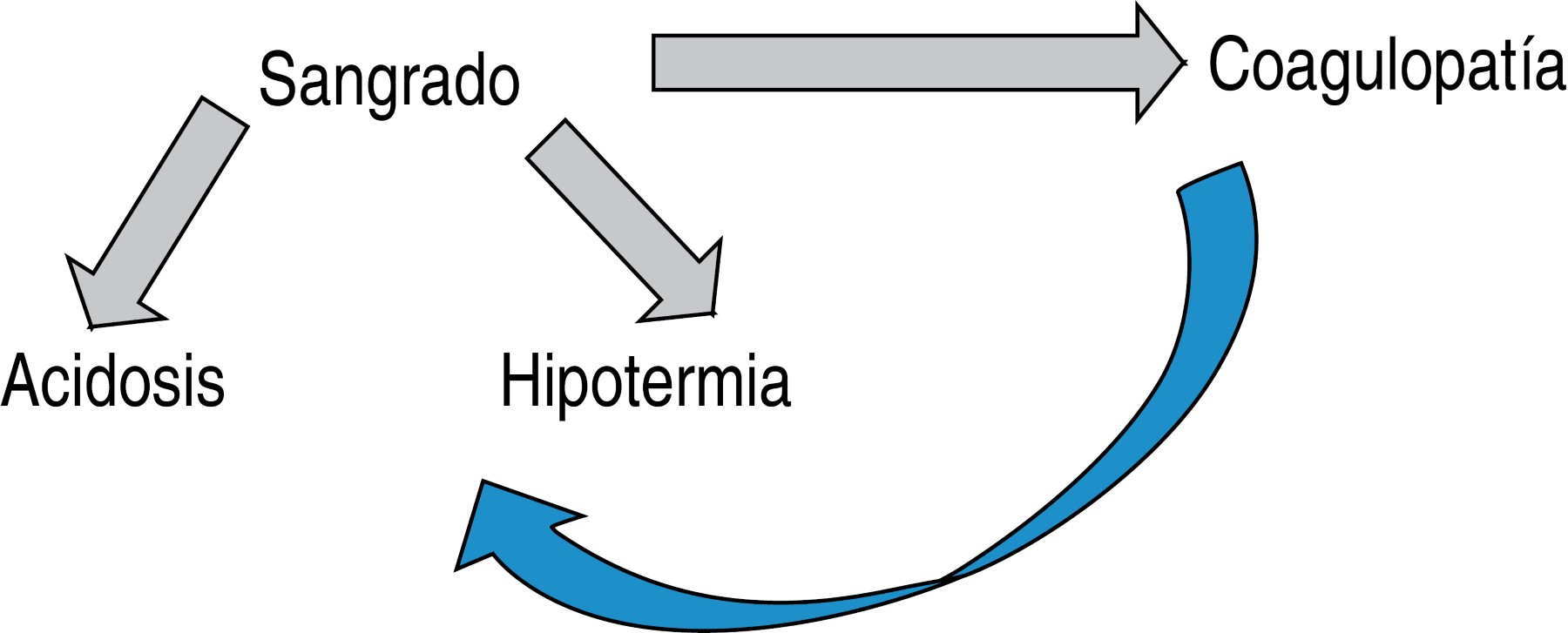 La presencia de coagulopatía, hipotermia y acidosis metabólica, "tríada mortal", fue descrita por primera vez por Burch en 1992.12 En un paciente gravemente lesionado conlleva un riesgo de mortalidad de hasta 90%.7 La hemorragia descontrolada y la terapia intravenosa iatrogenia resultan en el desarrollo de la traída letal, lo que conduce a un círculo vicioso que desencadena rápidamente la muerte.13