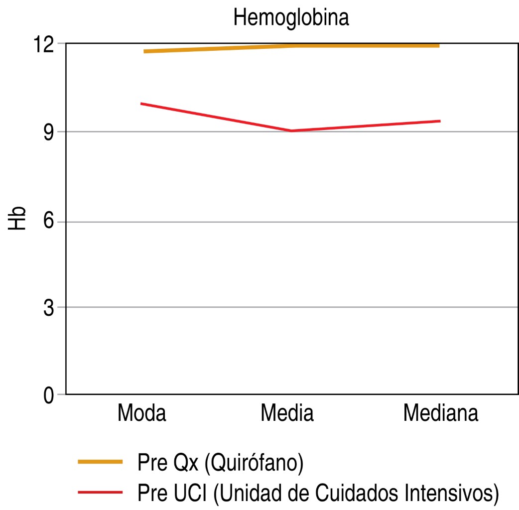 Para los niveles de hemoglobina en los pacientes sometidos a cirugía de control de daños se tomaron dos mediciones de los expedientes, uno previo al ingreso a la unidad de cuidados intensivos con una media de 9.1 mg/dl y moda de 10 mg/dl, y otra medición previa al segundo tiempo quirúrgico o ingreso a la tercera etapa de cirugía de control de daños, encontrando una moda de 11.8 mg/dl y una media de 12 mg/dl tal como se expresa en la Figura 3.