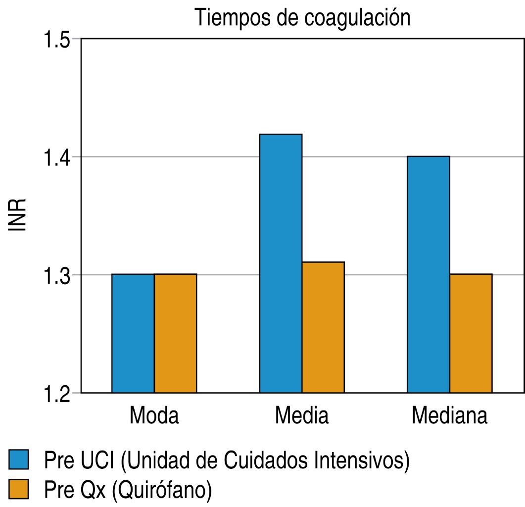 Dentro de la Figura 4 podemos observar los tiempos de coagulación con medición de acuerdo al INR (razón normalizada internacional) de la cual se tomaron dos mediciones, previo al ingreso a unidad de cuidados intensivos arrojando una media de 1.42 y una moda de 1.3 y previo a la tercera etapa de la cirugía de control de daños observando una media de 1.31 y una moda de 1.3.