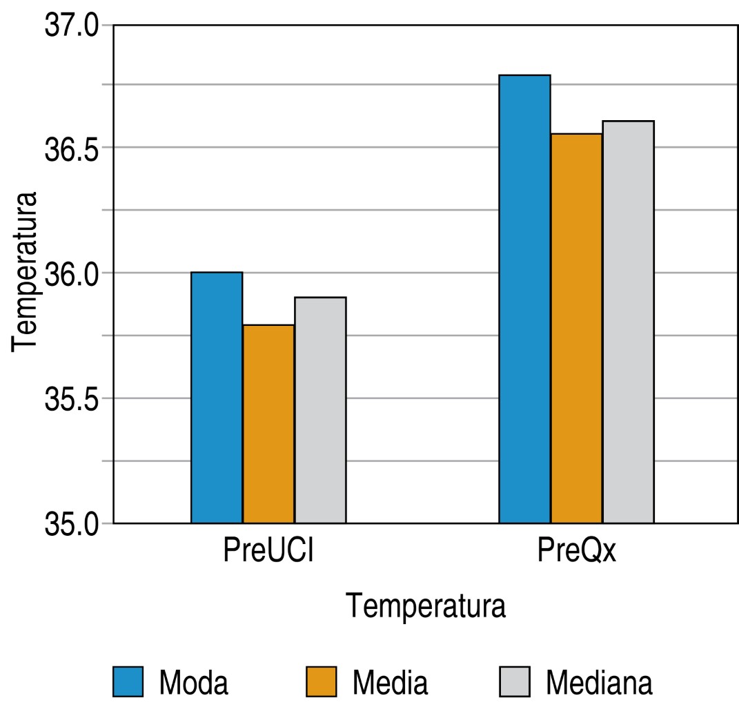 Para la temperatura se tomaron dos mediciones previas al ingreso a la unidad de cuidados intensivos, la cual nos otorga una media de 35.8 grados centígrados y una moda de 36 grados centígrados, y otra medición previa al ingreso a la tercera etapa de la cirugía de control de daños con una moda de 36.8 grados centígrados, una media de 36.5 grados centígrados y una mediana de 36.6 grados centígrados, esto expresado en la Figura 5.