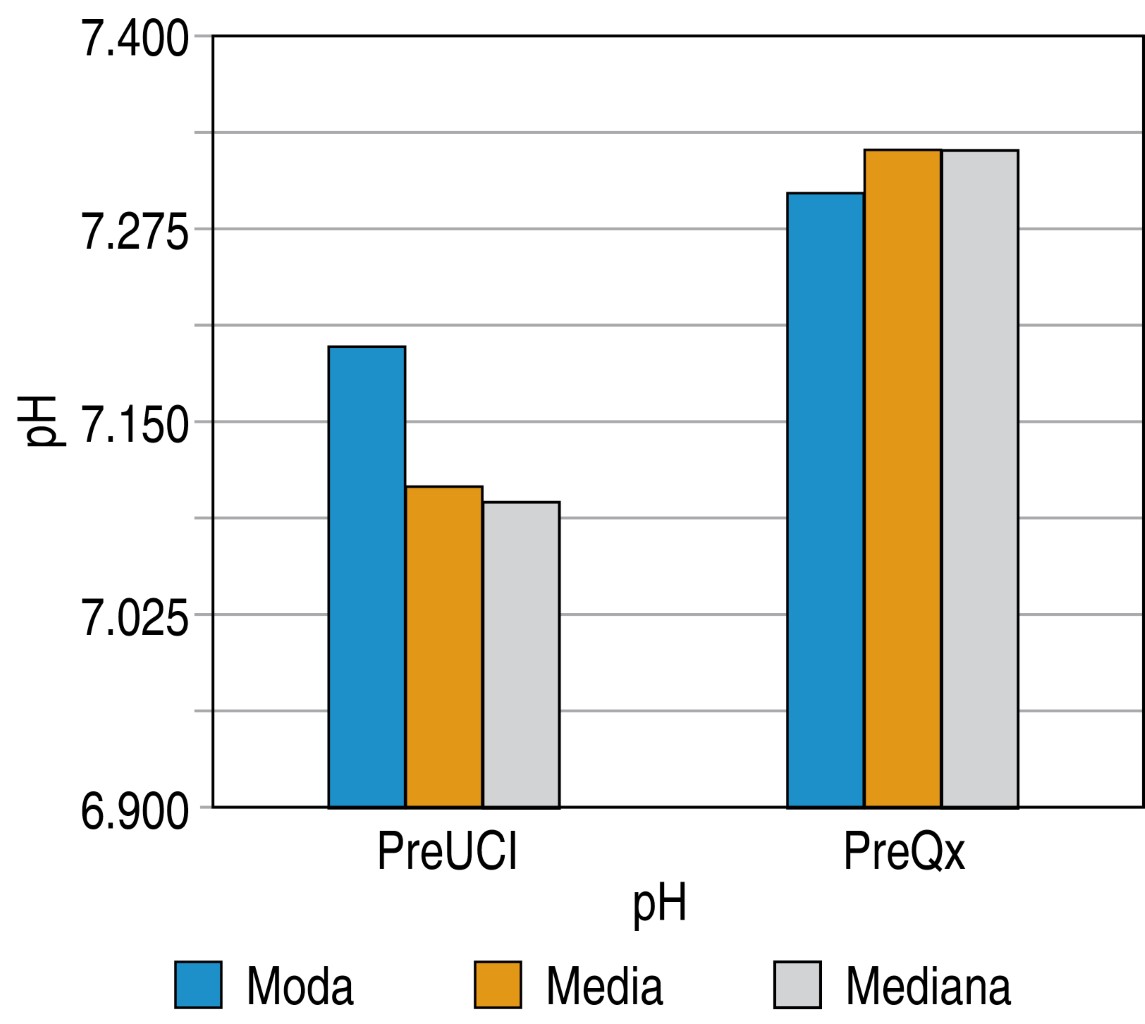 En la Figura 6 podemos encontrar el pH con el que llegaron los pacientes a la unidad de cuidados intensivos con una moda de 7.2 y una media de 7.1, y los valores que se obtuvieron previos al ingreso a la tercera etapa de la cirugía de control de daños con una moda de 7.3 y una media de 7.33.