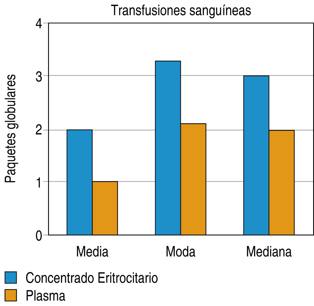 Para el número de transfusiones sanguíneas se observó una media de dos unidades de concentrado eritrocitario y una unidad de plasma con una moda de 3.3 unidades de concentrados eritrocitarios y 2.1 unidades de plasma, como son expresados en la Figura 7.