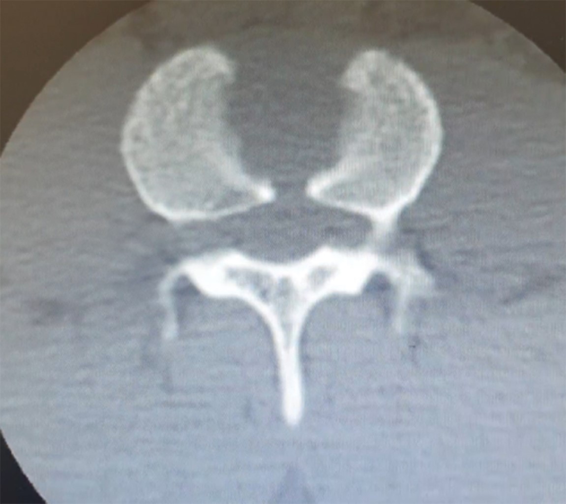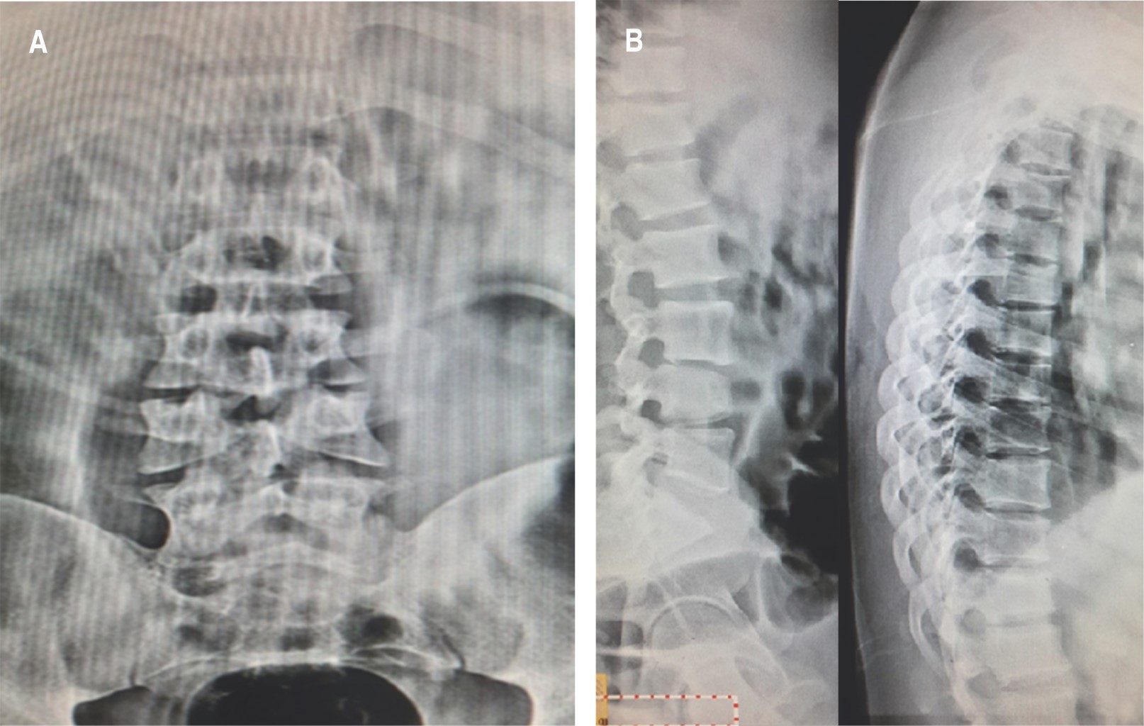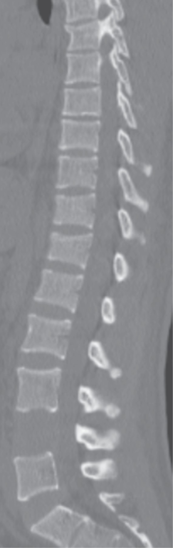 El examen radiográfico demostró rectificación de la columna cervical, además en radiografía lateral de columna lumbar se observó disminución de la plataforma superior del cuerpo vertebral de L4, con afectación de columna anterior y media de Francis Dennis, sin retropulsión a conducto medular, también en radiografía anteroposterior (AP) de columna lumbar se advirtió una incongruencia a nivel de L4 con ausencia de fusión de cuerpos vertebrales con diástasis de ocho milímetros (Figura 2).