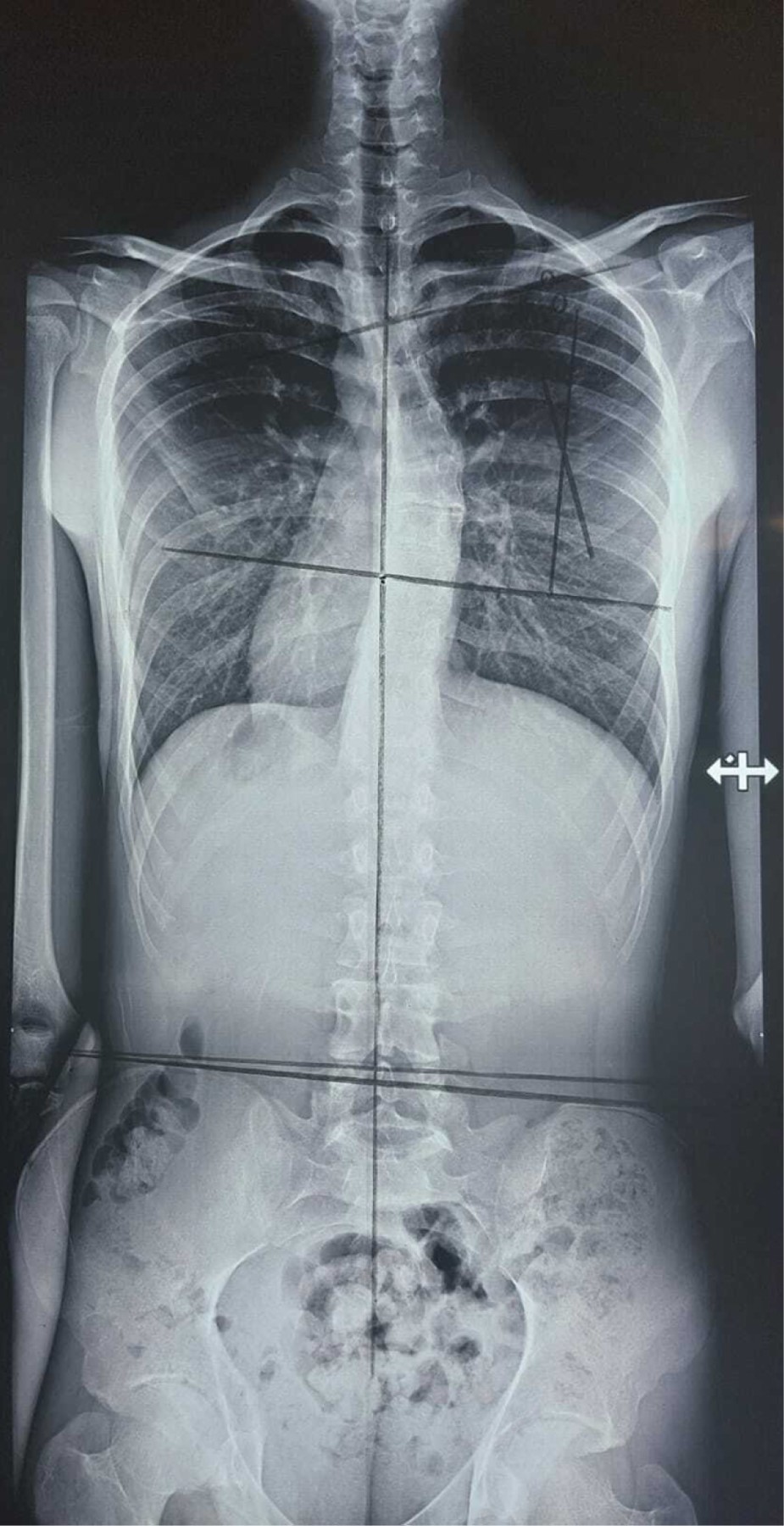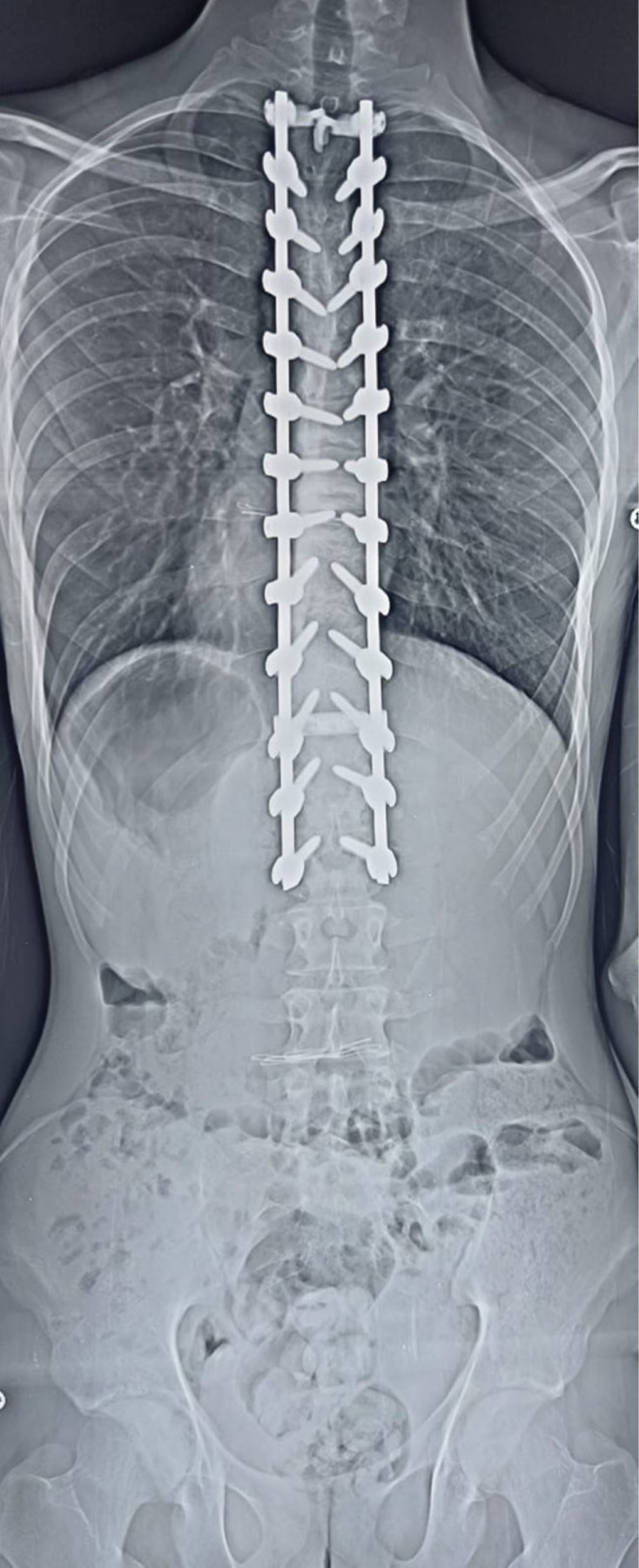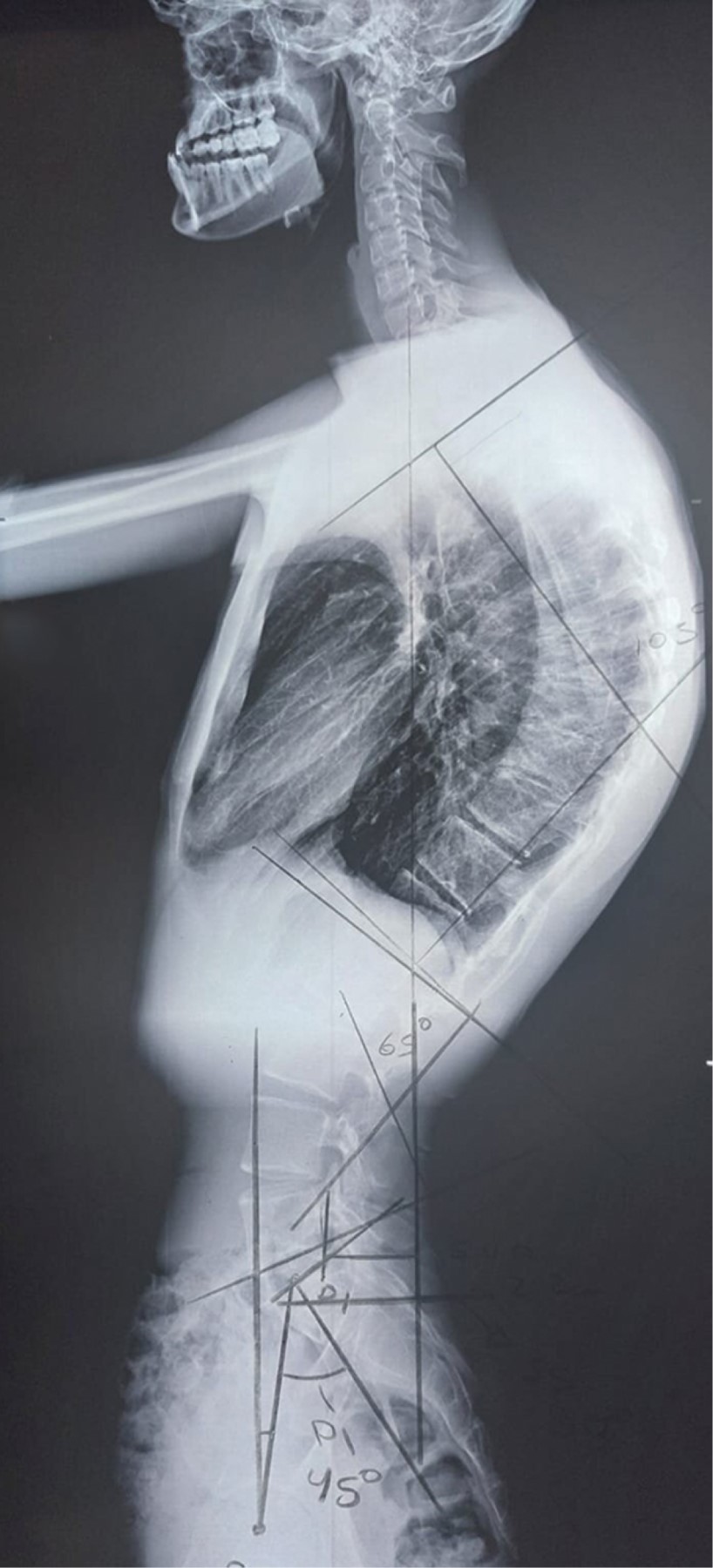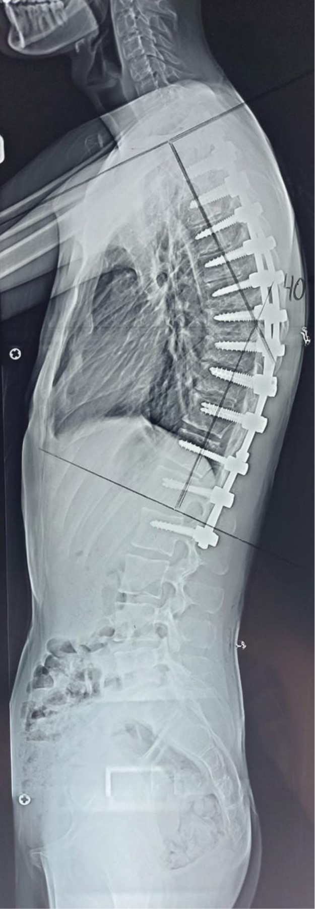 Paciente masculino de 22 años de edad y sin antecedentes de relevancia, el cual se presenta a consulta por deformidad, la cual le crea inseguridad estética y dolor recurrente de región torácica. Se solicitan radiografías anteroposterior (AP) y lateral panorámicas de columna, se detecta una deformidad de 105° de cifosis torácica (Figuras 1 y 2). Se propone al paciente realización de instrumentación posterior y fusión con corrección de curva torácica, quien acepta el tratamiento. Se realiza cirugía de instrumentación y fusión posterior exclusiva de T2 a L2 con tornillos poliaxiales mediante neuronavegación con O-ARM™ y neuromonitoreo (Figuras 3, 4 y 5). El paciente muestra buena evolución inmediata con una pérdida sanguínea menor de 200 ml durante las tres horas de procedimiento quirúrgico, además de buena evolución durante el primer, tercer y sexto mes con desaparición del dolor y corrección de curva a 40°(Figuras 6 y 7).