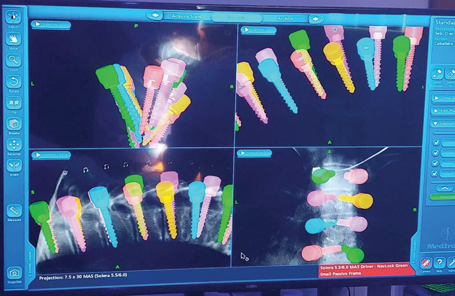 Las deformidades de columna son uno de los principales retos para los cirujanos especializados, ya que la anatomía se encuentra totalmente alterada perdiendo las referencias acostumbradas. La cirugía de alta tecnología mediante neuronavegación parece ser una excelente opción en deformidades, ya que facilita la colocación de tornillos pediculares, disminuye tiempos, pérdida sanguínea y produce precisión en la colocación de implantes. Sin duda alguna la tecnología está cambiando al mundo, esto incluye al ámbito médico y quirúrgico, lo que antes era un sueño, hoy puede ser realidad. Deberá evaluarse el costo-beneficio, a pesar de ello el uso de la neuronavegación se vuelve más accesible cada día y encamina a la cirugía mundial de columna a una nueva era donde las deformidades podrán ser tratadas con mejores resultados que los conocidos hasta ahora.