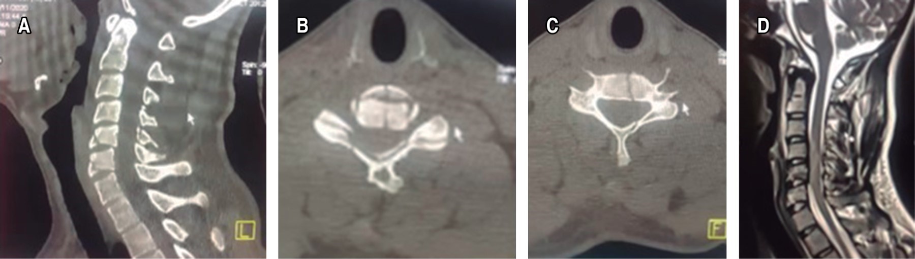 Posterior al interrogatorio y exploración física, se procede a solicitar estudios de gabinete con radiografías simples de columna cervical en proyecciones anteroposterior y lateral, así como tomografía axial computarizada, donde se observa desplazamiento anterior del cuerpo vertebral C5 sobre C6 e incongruencia articular facetaria mismos niveles. Se indica inmovilización con collarín rígido a permanencia en espera de realizar el complemento del estudio de imagen con una resonancia magnética nuclear simple de columna vertebral cervical corte sagital y axial T2 con presencia de compresión medular y lesión de complejo ligamentario posterior C5-C6. Se integra diagnóstico de luxación AO C5-C6:C (F4;N2;M1) ASIA D SLICS 5 y se procede a programar evento quirúrgico (Figura 1).