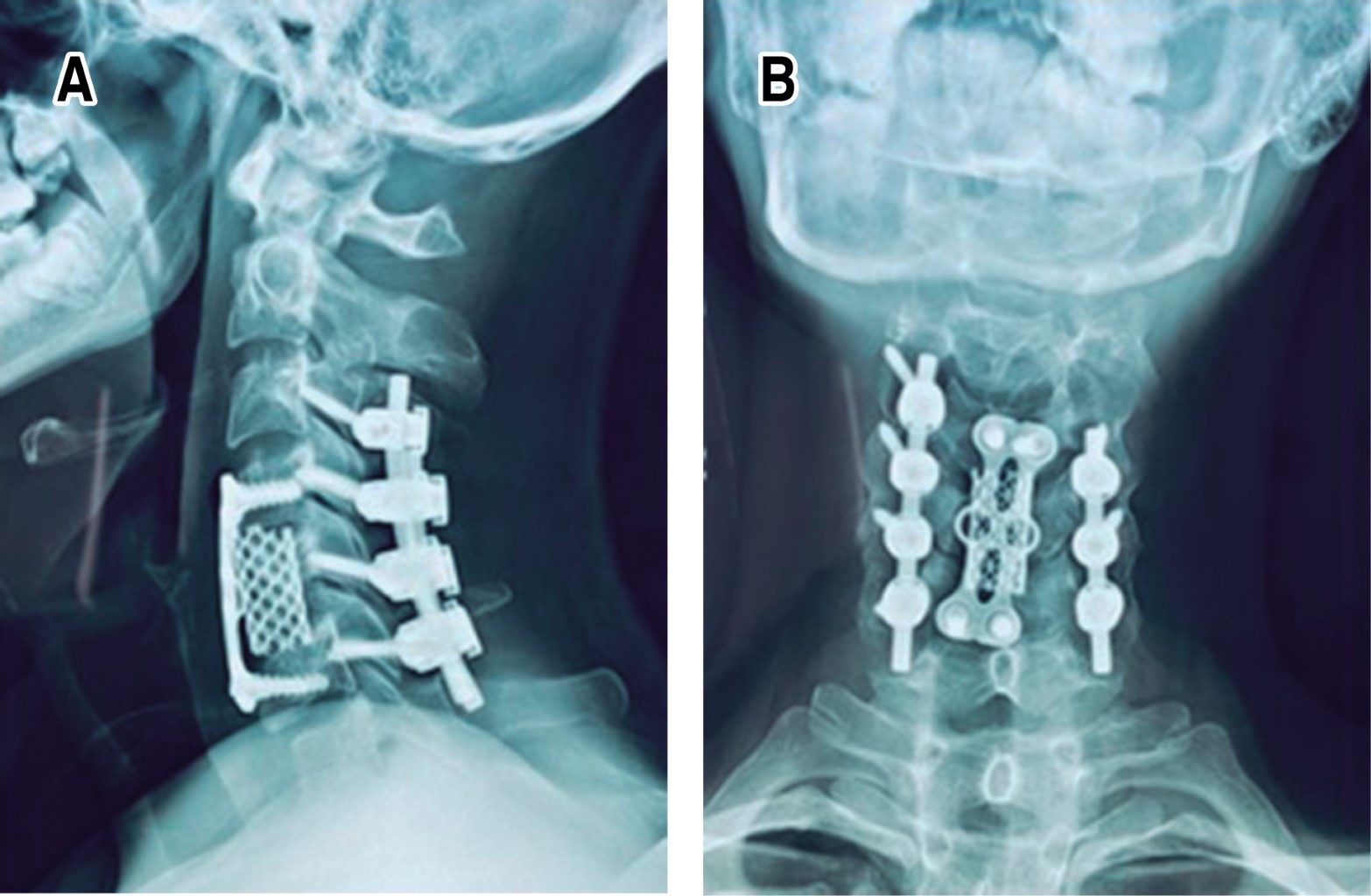 Ingresa para tratamiento quirúrgico con doble abordaje cervical en un solo tiempo quirúrgico. Se realiza un abordaje cervical posterior con estabilización a masas laterales C5-C7 e instrumentación transpedicular T2, laminectomía C6-C7, artrodesis posterolateral y, posteriormente, con la paciente en decúbito supino, se efectúa un abordaje cervical anterior con discectomía C6-C7 más fusión con caja intersomática PEEK C6-C7 y colocación de placa cervical anterior. La duración de la cirugía fue de cinco horas 45 minutos y un sangrado reportado de 600 mililitros (Figura 4).