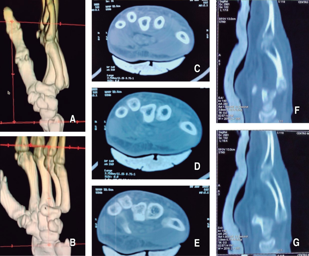 El mecanismo de lesión en la mayoría de los casos se asocia a un traumatismo de alta energía sobre el dorso de la mano, siendo más frecuente accidentes automovilísticos y de motocicleta, caídas, puñetazo o traumas contusos directos.3 Por lo que la cinemática del trauma del caso prestado coincide con los mecanismos descritos en la literatura. La lesión se desencadena por una fuerza axial compresiva aplicada sobre el dorso de la cabeza del metacarpiano, desplazando volarmente la cabeza y dorsalmente la base, causando ruptura de los ligamentos estabilizadores.12,13,19 Cuando se registran luxaciones múltiples, como es el caso presentado, son resultado de trauma de mayor energía sobre la superficie palmar de la mano. La gravedad del desplazamiento depende de la posición de la mano, la muñeca y la intensidad de la fuerza aplicada.