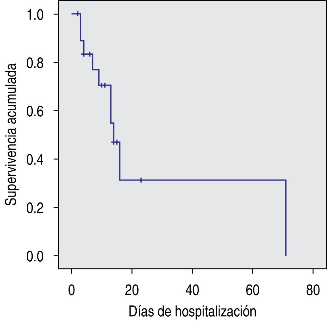 El promedio de días de hospitalización fue de 13.2 días (2-71). En nuestra serie murió 52.6% (10) de los pacientes, 73.68% (14) desarrollaron disfunción aguda de injerto; sin embargo, sólo cinco (26.31%) requirieron terapia de reemplazo renal durante su evolución. Únicamente hubo pacientes con curso clínico severo y crítico; todos aquellos con curso crítico y uno de curso severo fallecieron. La media de días desde el ingreso hasta la muerte fue de 15.3 días (3-71) y la media de días desde el ingreso hasta el alta en los supervivientes fue de 11 (2-23).