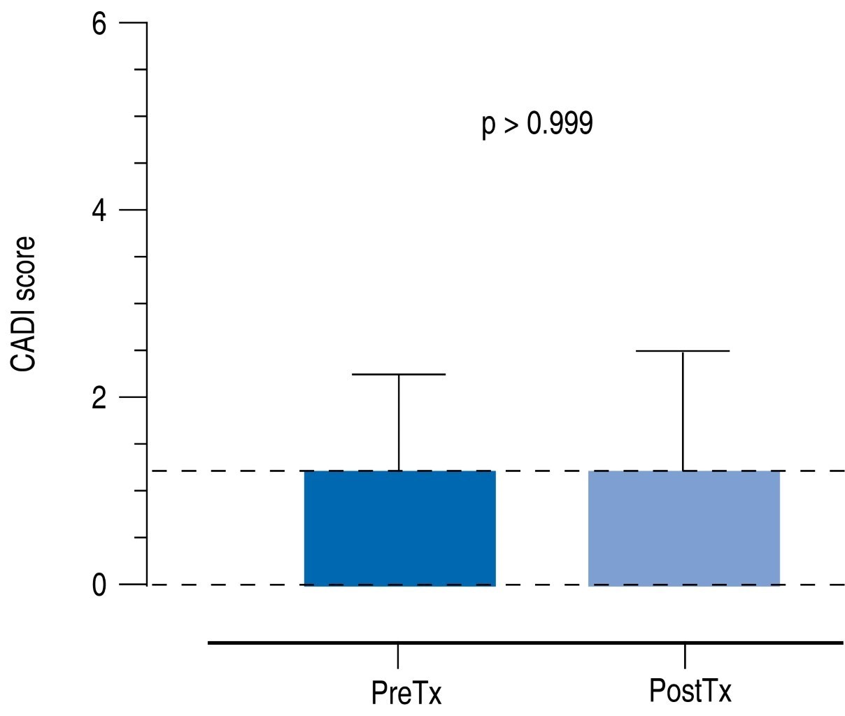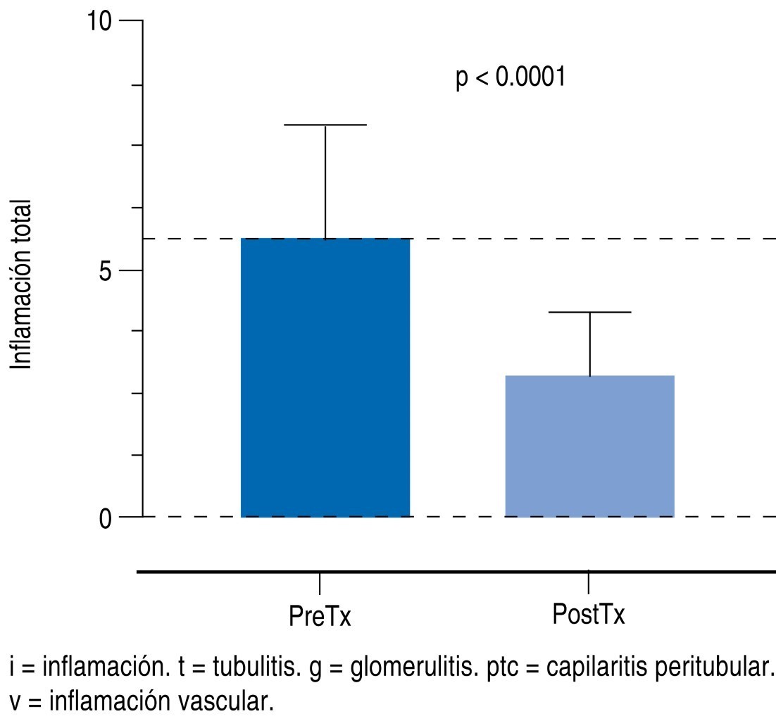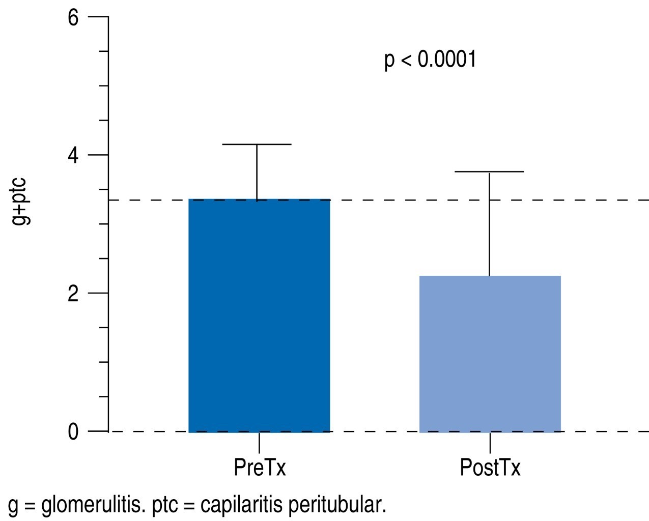 La respuesta al tratamiento se evaluó de acuerdo con la indicación y resultados de la biopsia de seguimiento. En la biopsia de seguimiento posterior al tratamiento encontraron que tanto la positividad como la severidad de RAMA habían disminuido; sin embargo, a pesar de que g+ptc e i+t habían disminuido, se observó incremento en fibrosis intersticial y atrofia tubular (IFTA), así como en fibrosis de la íntima media + hialinosis arteriolar (CV+AH) (0.8 ± 0.9 y 1.0 ± 0.9). La glomerulopatía del trasplante (TXG) fue encontrada en 43% (14 pacientes) de los 33 pacientes, de ellos 13 fueron no respondedores. En la biopsia final de seguimiento encontraron glomerulopatía del trasplante en nueve pacientes. La respuesta clínica y bioquímica satisfactoria al tratamiento fue encontrada en 76%; sin embargo, no así la respuesta histopatología. Después del tratamiento, la creatinina y los hallazgos histopatológicos mostraron mejoría en 18 de 33 pacientes (55%). En 15 casos no se obtuvo respuesta al tratamiento y se requirió tratamiento adicional. La eficacia del tratamiento valorada por creatinina fue encontrada en 76% de los pacientes. En la biopsia postratamiento de seguimiento, el rechazo fue totalmente erradicado sólo en 20 de los 33 pacientes que presentaron RAMA + rechazo mediado por células T (61%) y los hallazgos histopatológicos se caracterizaron por cambios inespecíficos. En las biopsias finales de tratamiento, nueve pacientes tenían RAMA crónico, uno amiloidosis, dos nefritis intersticial y uno nefropatía por BK. La media del score de CADI fue 4.25 ± 2.4 (rango del 1 al 10).25