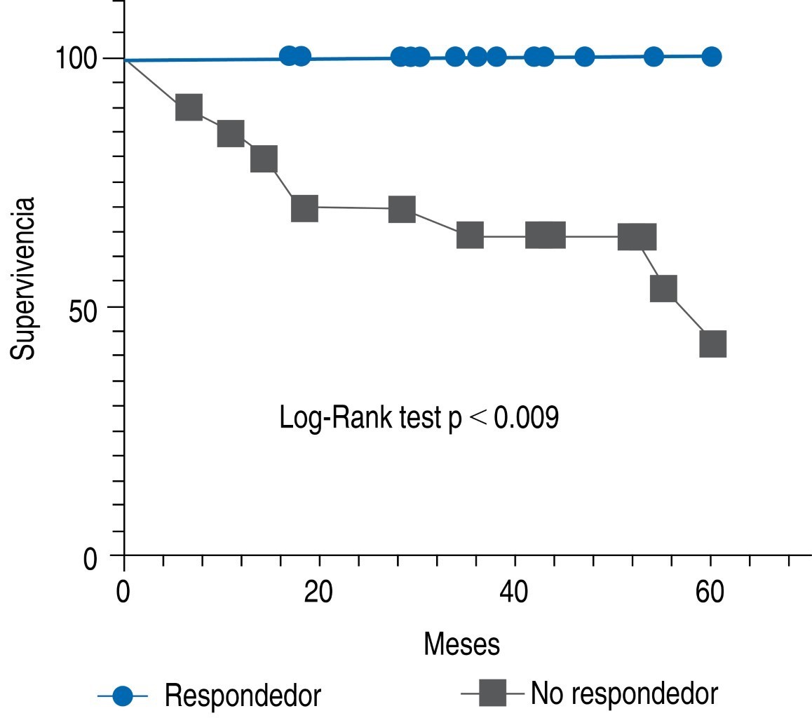 La supervivencia global del injerto un año después del tratamiento se encontró en 34 pacientes (91.8%). La supervivencia global del injerto a los 60 meses fue de 75.6% (28 pacientes), conservando la función del injerto en 100% a los 60 meses en el grupo de los respondedores y en 45% de los no respondedores, p < 0.009 (Figura 5).