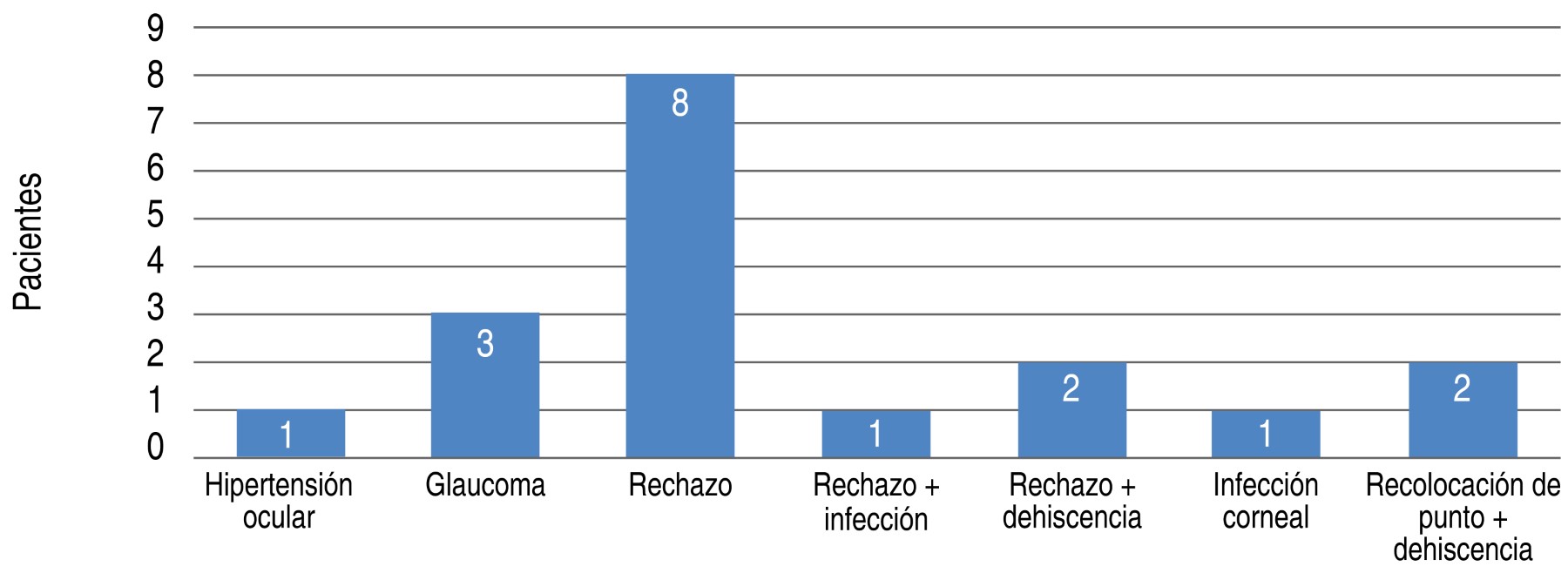Las complicaciones oftalmológicas posteriores al trasplante corneal se presentaron en 26% de la población pediátrica, así 44% fue secundario a rechazo del injerto corneal. Las características propias del ojo pediátrico, así como la dificultad en el apego al tratamiento y rehabilitación postquirúrgica siguen siendo todavía un gran obstáculo para el éxito anatómico y funcional.