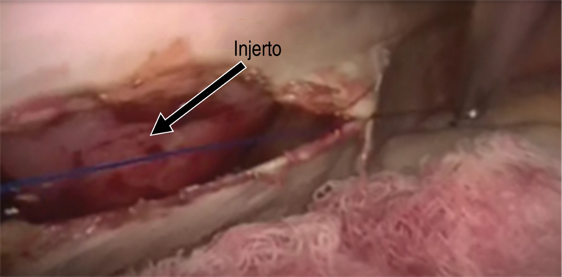 Se trata de un hombre de 72 años de edad con enfermedad renal estadio V secundario a hipertensión arterial en hemodiálisis desde hace dos años. Es sometido a un trasplante renal de donante cadavérico, con adecuada evolución postoperatoria, creatinina sérica de ingreso de 14 g/dL con disminución de azoados a 3 g/dL a las 24 horas de postoperatorio; sin embargo, persiste con gastos de 150 cm3 en 24 horas a través del drenaje blake de característica serosa, por lo que se decide realizar una determinación de creatinina del drenaje encontrando creatinina similar a la sérica, por lo que se hace diagnóstico de linfocele, continúa con adecuada evolución; sin embargo, persiste con volúmenes entre 300 y 350 cm3 por el drenaje, corroborando colección perinjerto en sitio de hilio, se decide realizar una ventana peritoneal laparoscópica encontrando una colección de 300 cm3 la cual se comunica y se orlea con Prolene de 2-0 el borde peritoneal (Figura 1). El paciente evoluciona adecuadamente sin gasto a través del drenaje, se decide retirar el mismo y egresar.