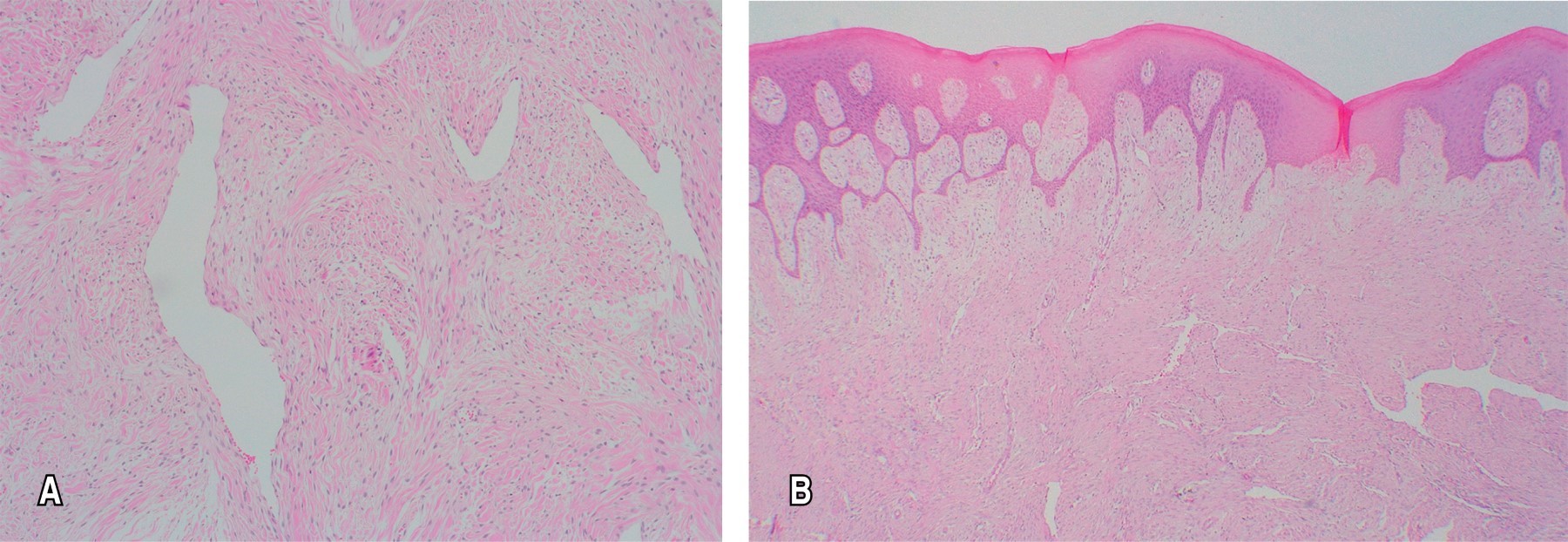 De forma histológica, el MF es una lesión bien circunscripta pero no encapsulada,9 en ocasiones exhibe un patrón bifásico con áreas de tinción claras y oscuras. El área clara consiste en células ahusadas con citoplasma eosinófilo y núcleos cónicos dispuestos en fascículos cortos o en espirales con nódulos en su periferia. Sin embargo, estas células en ocasiones se distribuyen de forma aleatoria a lo largo de la lesión.20 El área oscura de la lesión se presenta en la porción central de la misma, al contener células ahusadas primitivas asociadas a un patrón de células vasculares hemangiopericitomatosas.8