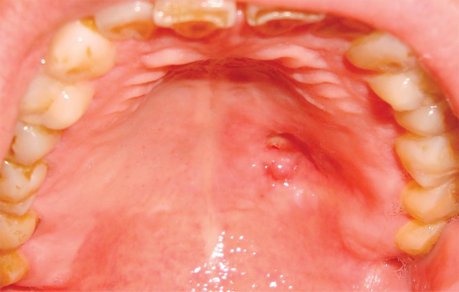De forma clínica, el MF de cavidad oral se presenta como una masa firme, indolora, de coloración que varía de rosada a roja.6 En ocasiones, por acción de la dinámica masticatoria estas lesiones pueden ulcerarse y presentar sintomatología asociada. Capo y colaboradores17 reportaron el caso de una paciente de nueve años de edad con un MF de ubicación palatina, con ulceración de su superficie y destrucción ósea asociada. Dependiendo de la ubicación y el tamaño de la lesión pueden producirse obstrucciones de la vía aérea18 o parestesias.19