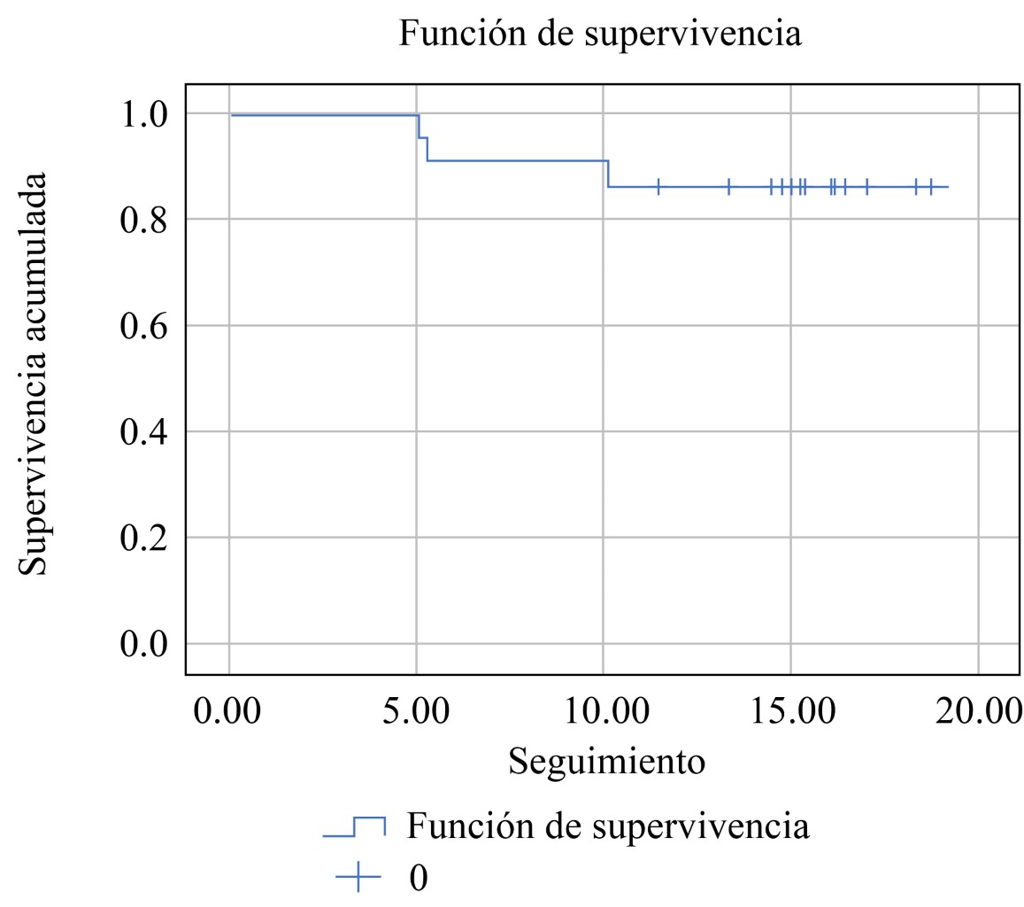Supervivencia. El análisis de la curva de Kaplan-Meier para la reintervención con artroplastía de cadera por progresión de la artrosis identificó que la supervivencia acumulada de la articulación a los 10 años sería de 90.9% y a los 15 años de 86.4% (Figura 2).