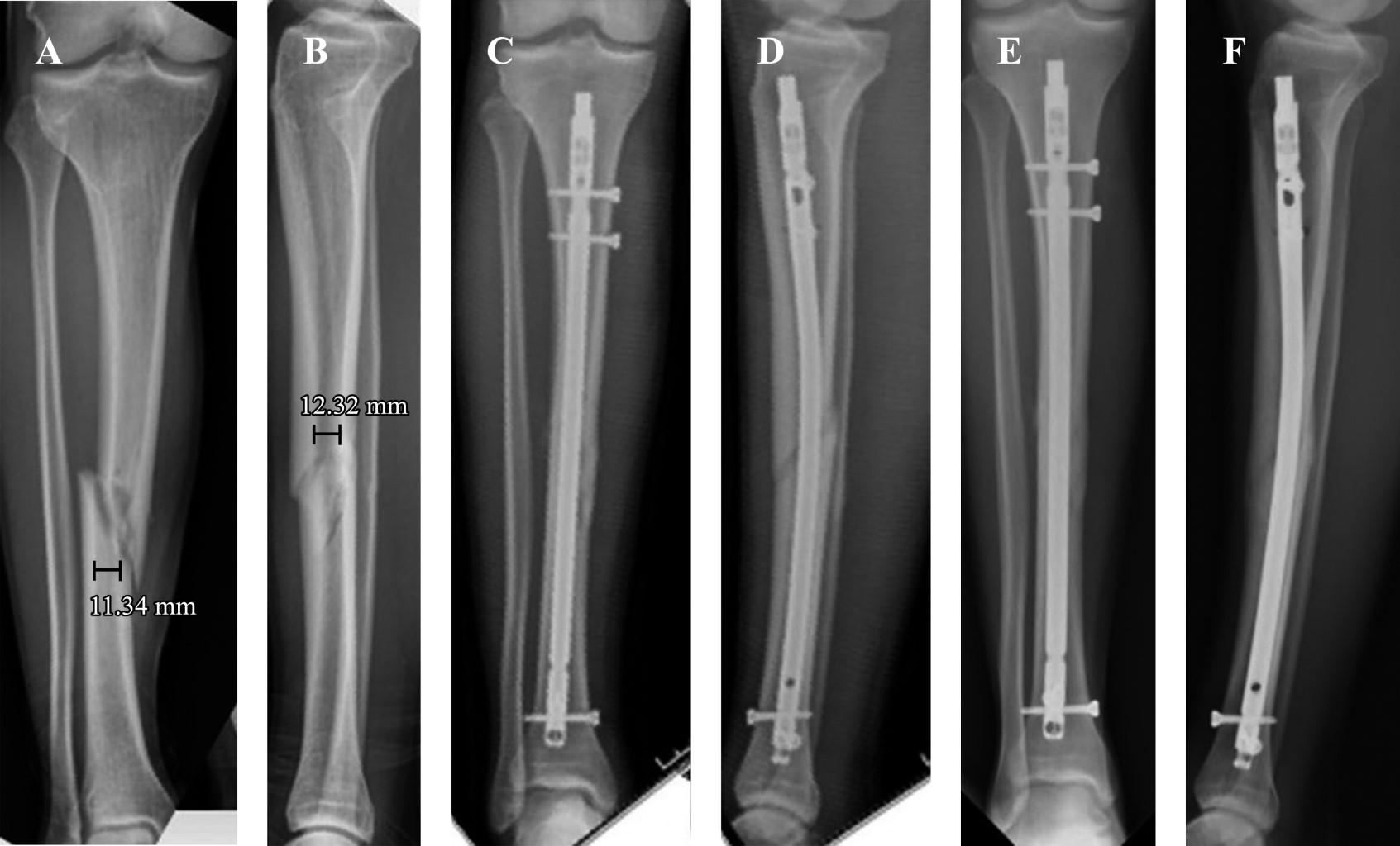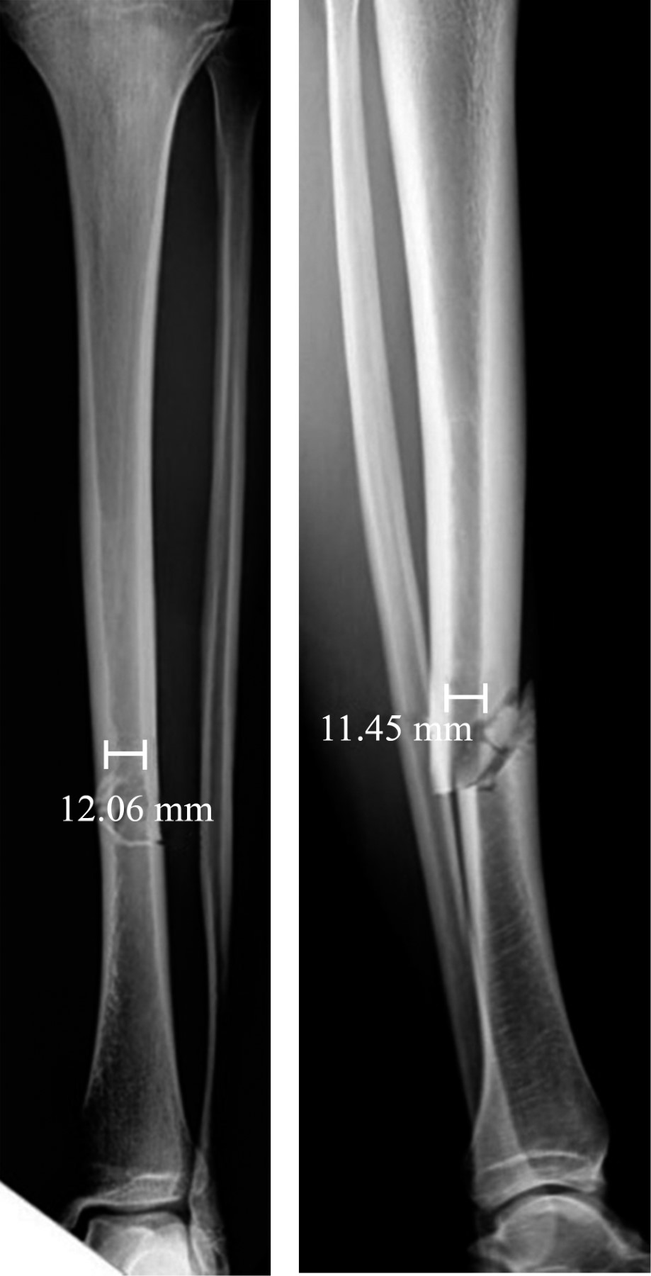 El análisis radiográfico fue realizado utilizando las proyecciones anteroposterior (AP) y lateral (L) de pierna. Con las radiografías del ingreso catalogamos las fracturas según la clasificación OTA/AO. Para determinar el diámetro del canal medular y evitar un sesgo de precisión utilizamos el software digital Synapse (Fujifilm Corporation) de nuestro centro. Dichas mediciones se realizaron en ambas proyecciones radiográficas (AP y L) a nivel del istmo en las radiografías de la lesión (Figura 1). Estas mediciones se realizaron en dos oportunidades (con un intervalo de tres meses) por dos observadores independientes y las diferencias se resolvieron por consenso junto al cirujano más experimentado. El diámetro del clavo se obtuvo de los registros del protocolo quirúrgico.