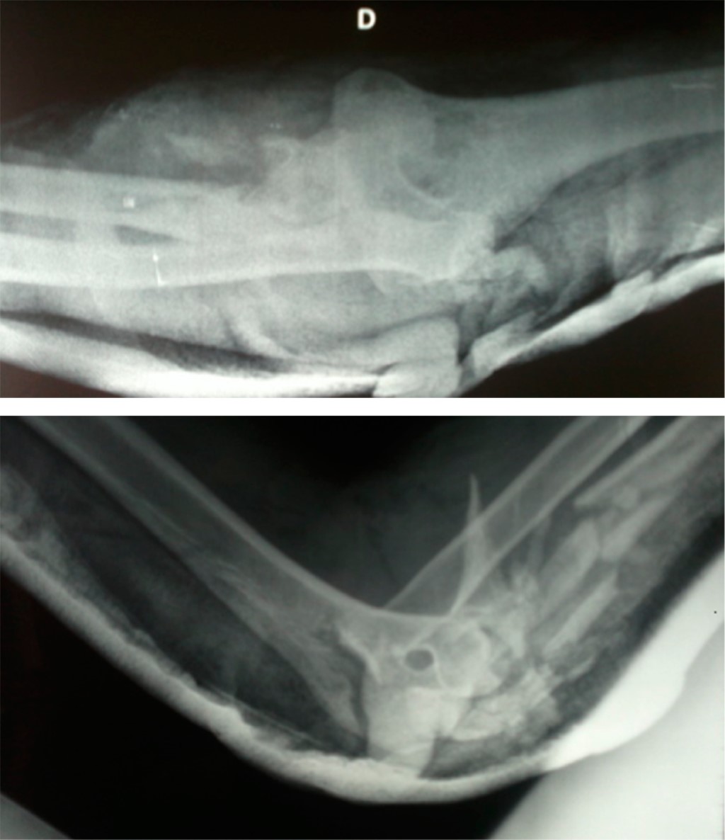 De urgencia se realizó reducción cerrada de la cabeza radial y fijación provisional con dos agujas de Kirschner percutáneas, cierre de la herida, inmovilización con férula de yeso braquial y profilaxis antibiótica con cefalosporina. A los seis días se llevó a cabo la estabilización definitiva de la fractura mediante una placa de reconstrucción de titanio en el cúbito y fijación de la apófisis coronoides con un tornillo (Figura 2). El paciente no volvió a acudir a la evaluación tras ocho meses postoperatorios.