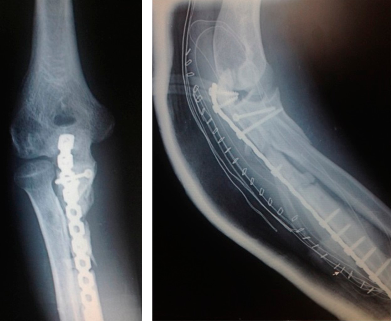 A los dos años postoperatorios, el paciente regresó a la consulta por tener dolor en el codo y grandes defectos de cobertura cutánea con exposición del material de osteosíntesis (Figura 3). Algunos de los tornillos de la placa de cúbito habían sido extraídos por el propio paciente. Se le aconsejó el retiro de la placa, debido al riesgo de infección, pero el paciente se rehusó y no volvió para revisión.