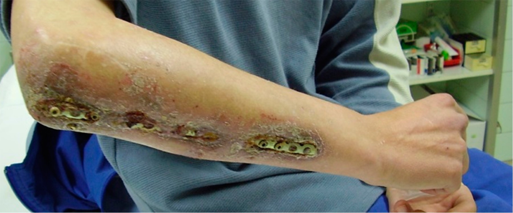 Mantener el material de osteosíntesis a pesar de una dehiscencia cutánea extensa con osteosíntesis expuesta es inevitable en algunos casos; sin embargo, Melhem y colaboradores1 observaron la consolidación ósea y reepitelización en niños, al igual que nosotros lo hemos observado en un adulto.