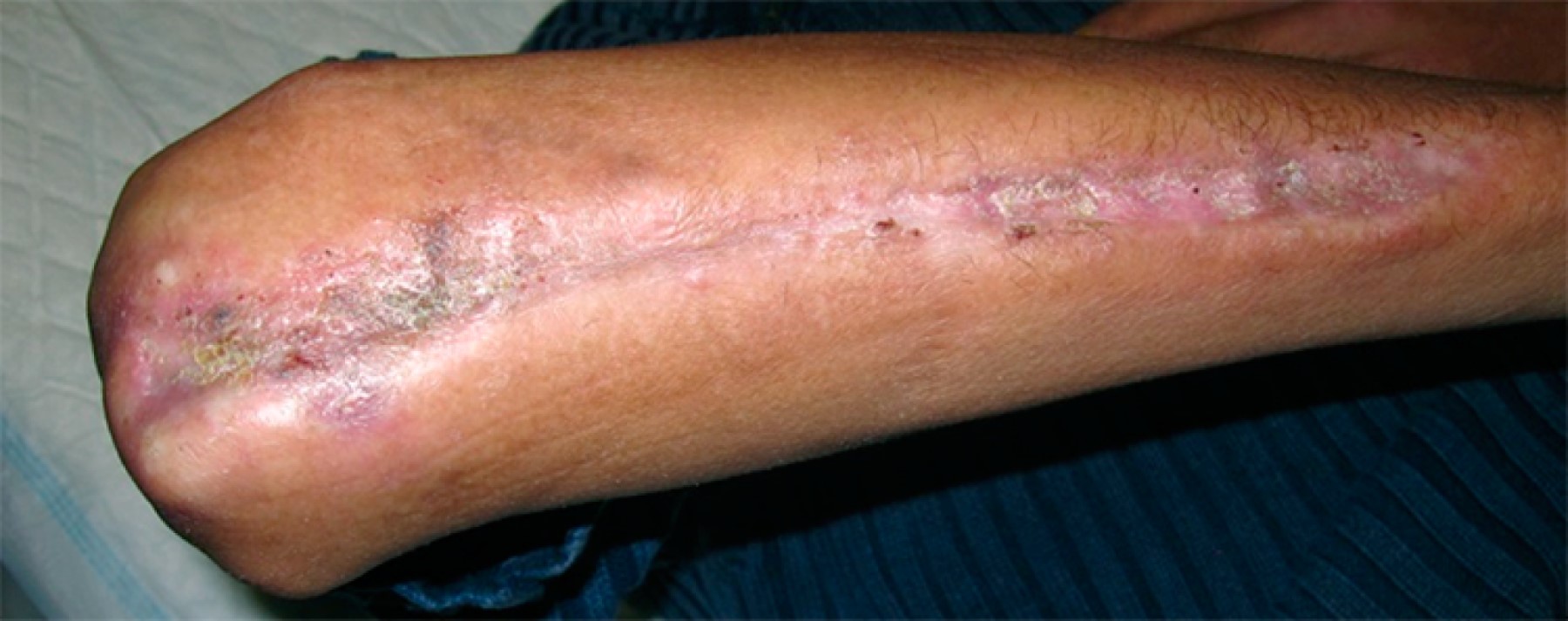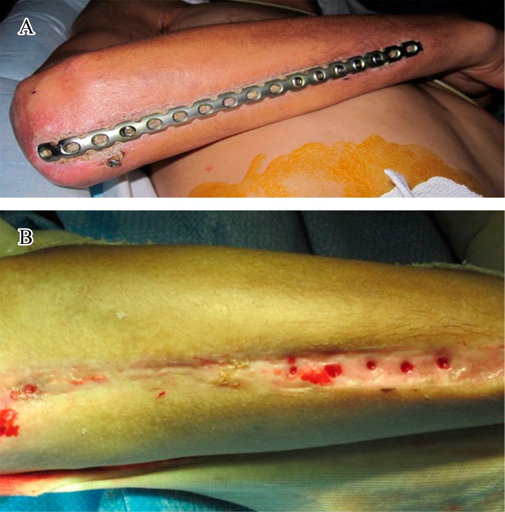 El manejo más seguro ante una dehiscencia de la herida y exposición del material de osteosíntesis parece ser el retiro de la fijación interna si la fractura está consolidada o en su caso colocar un fijador externo, seguido de desbridamiento de los bordes y valoración de la necesidad de cobertura de partes blandas mediante injerto.