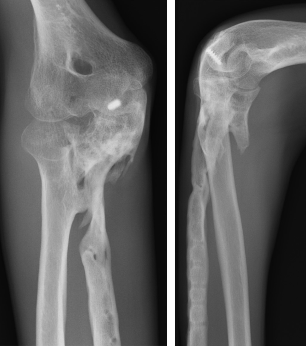 Un hombre de 39 años, drogodependiente en tratamiento con metadona, sufrió un accidente con el cual presentó una fractura luxación de Monteggia, abierta grado II de Gustilo y multifragmentaria de cúbito derecho (Figura 1). No había déficit nervioso.
