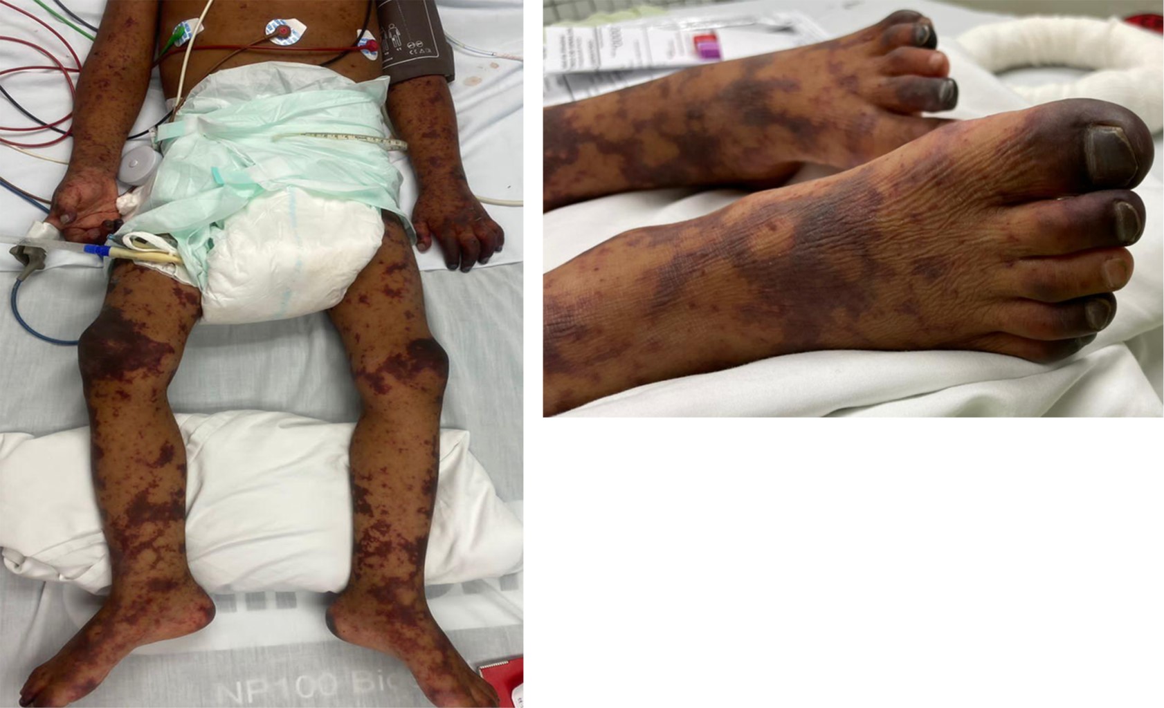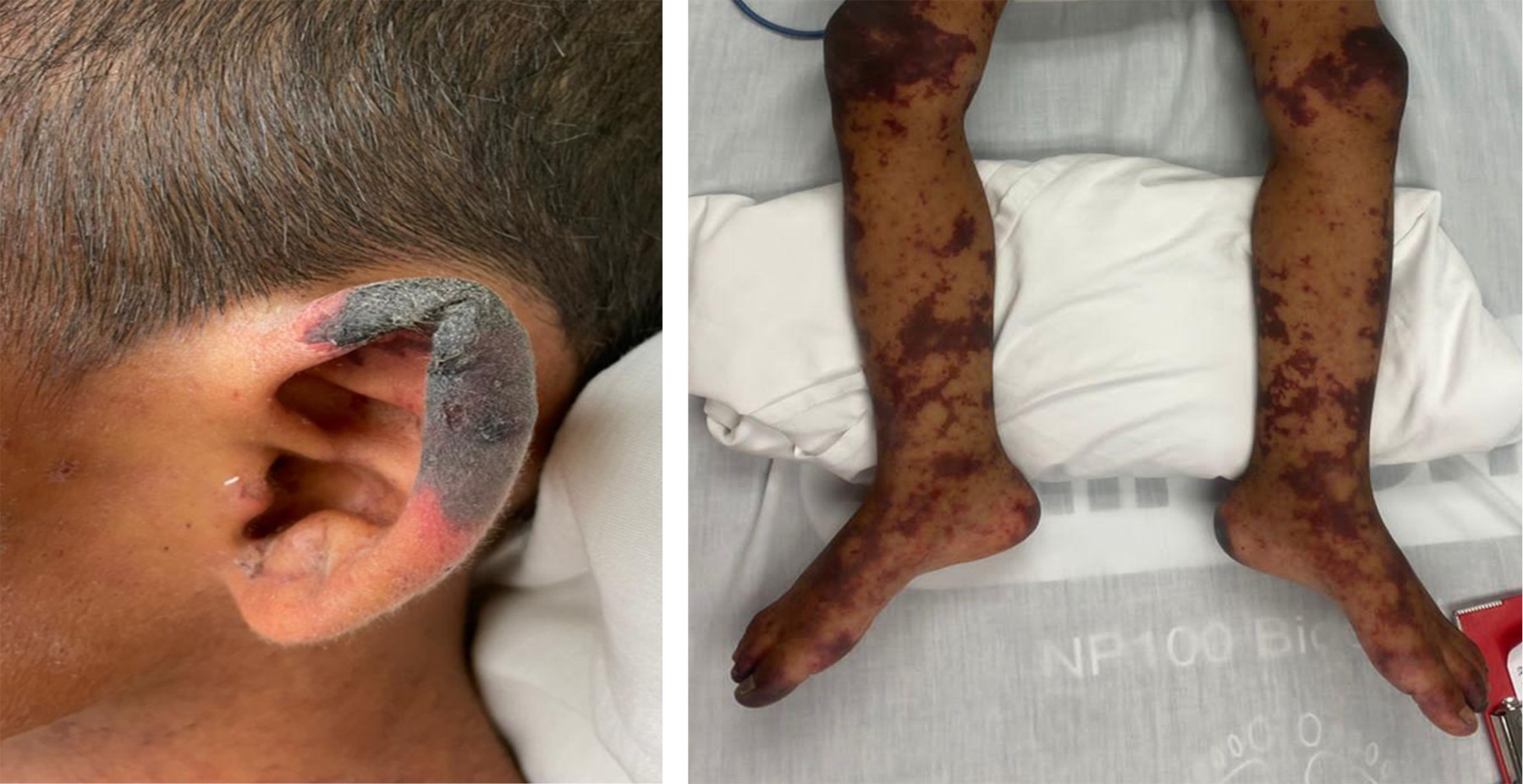 Masculino de seis años de edad, residente de Nayarit, con padecimiento de 18 días de evolución, fiebre no cuantificada, rinorrea y vómito, su médico de primer nivel le prescribió sintomáticos, sin mejoría; 12 días previos a su ingreso se agregó lesión dérmica violácea en palmas y plantas, además de mialgias y artralgias, por lo que fue referido con diagnóstico de púrpura trombocitopénica trombótica y coagulación intravascular diseminada. Ingresó en malas condiciones hemodinámicas y con deterioro, por lo que requirió apoyo con ventilación mecánica asisto-controlada, así como empleo de aminas. A nivel cutáneo tenía lesiones purpúricas palpables, diseminadas y zonas de necrosis en pabellones auriculares y en ortejos de dedos de las cuatro extremidades, además de hepatomegalia (Figura 2). Al reinterrogatorio se refirió antecedente de convivencia con perros, gatos; así como lesiones secundarias a mordedura de garrapata.
