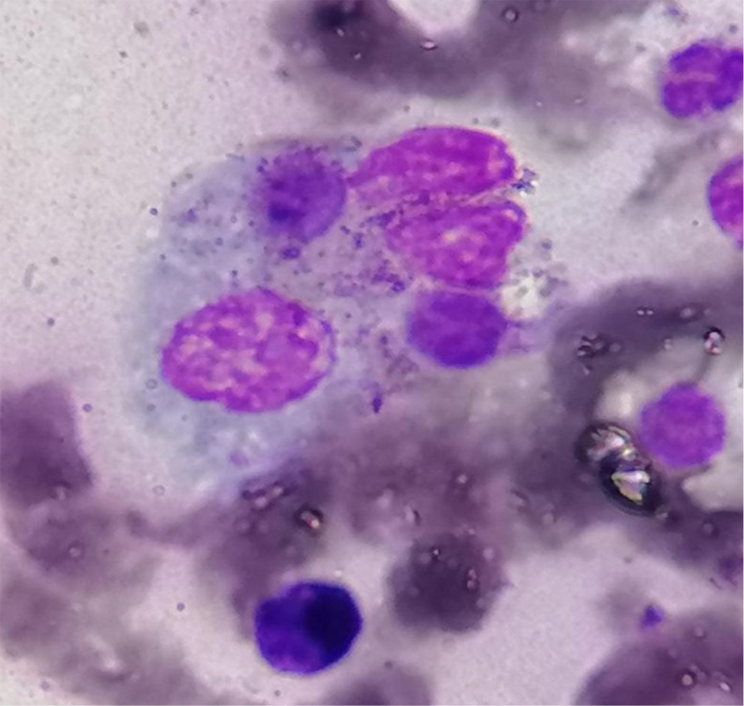 Se ingresó al paciente con diagnóstico de púrpura trombocitopénica idiopática. Los servicios de hematología e inmunología consideraron como diagnóstico linfohistiocitosis hemofagocítica secundaria probable a fiebre manchada; mismo que se confirmó primero con Proteus OX 19 1:1280, corroborado por inmunofluorescencia. En el aspirado de médula ósea observaron hemofagocitosis (Figura 3). El tratamiento se basó en doxiciclina (5 mg/kg/dosis), dexametasona 6 mg/kg dos dosis por dos semanas y disminución gradual como está estandarizado, gammaglobulina 2 g/kg dosis única con adecuada respuesta clínica y egresado por presentar mejoría.