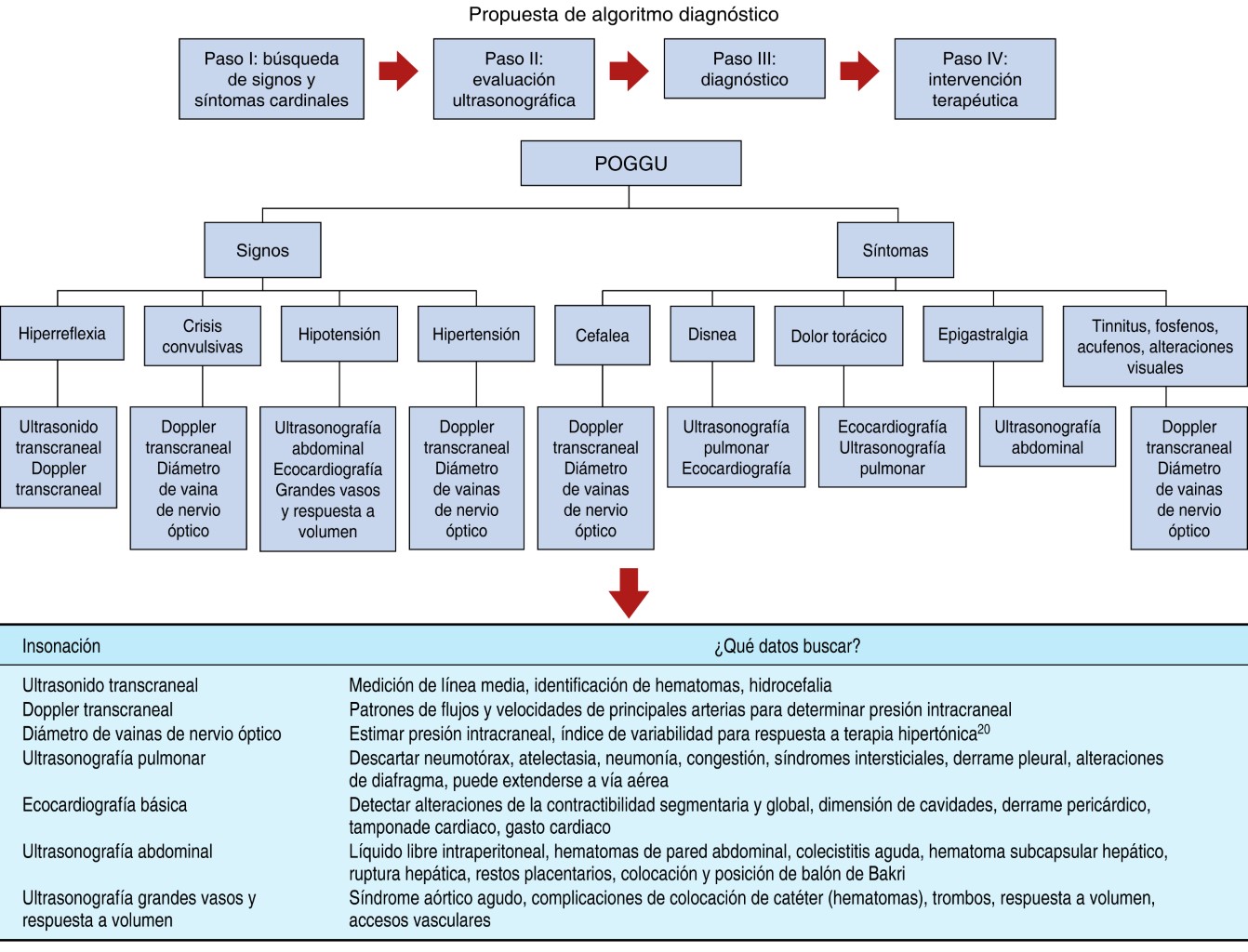 El protocolo POGGU está conformado por la evaluación de primera estancia de cuatro signos y cinco síntomas cardinales como ejes rectores y reactivos para realizar un ultrasonido point of care y pasar, si es necesario, a un ultrasonido sistémico con la posterior valoración por medio de la ultrasonografía para complementar, junto con la clínica, e integrar un razonamiento etiológico (o causa del signo o síntoma) logrando una integración diagnóstica de la enfermedad de manera certera y así, iniciar un tratamiento adecuado de forma precoz con el fin de evitar el desarrollo de complicaciones y desenlaces fatales en las pacientes obstétricas.
