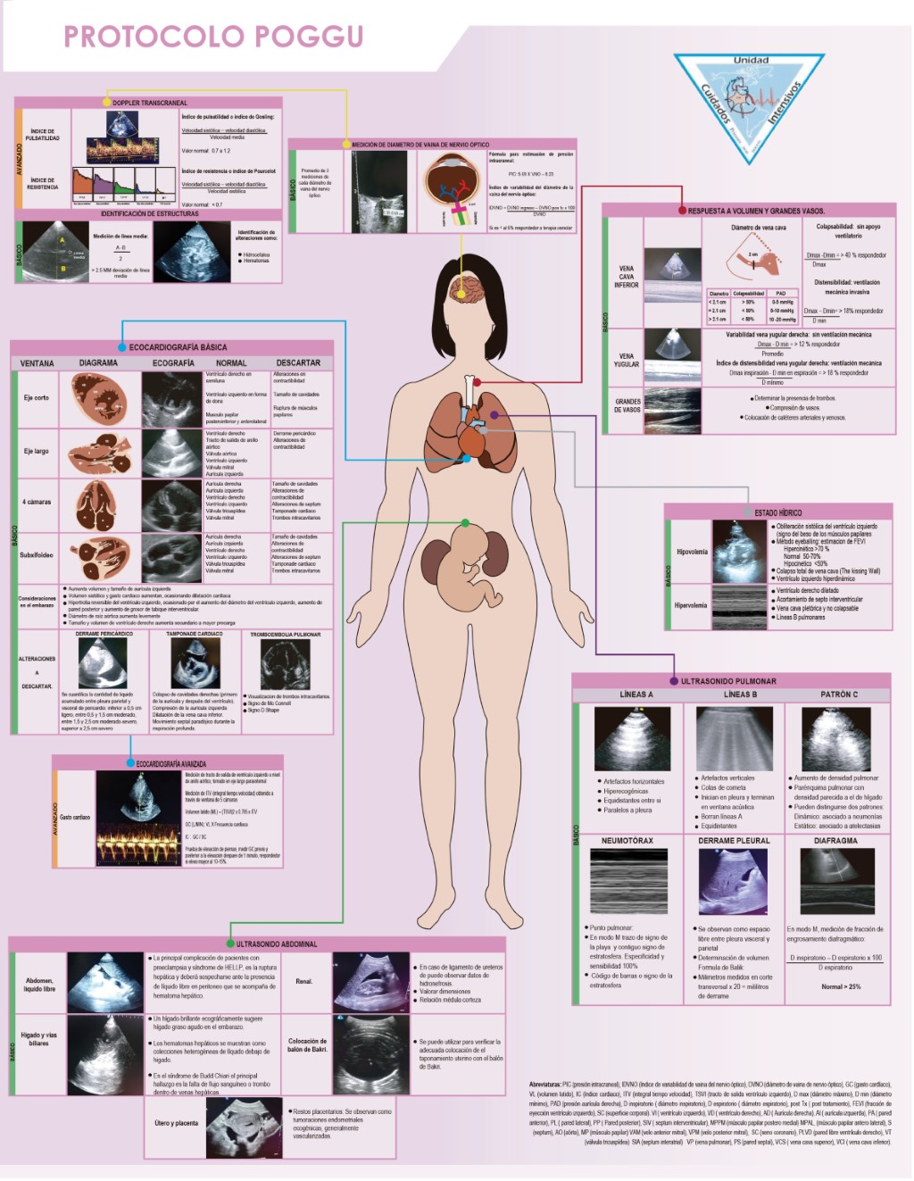 Es aquí donde cobra relevancia el uso de la ecografía como método diagnóstico en las pacientes obstétricas graves, siendo éste durante la última década un sistema de monitorización y detección de enfermedades potencialmente graves y mortales, considerado hoy en día como una extensión de la evaluación clínica del paciente. Su uso no sólo ha demostrado superioridad en el diagnóstico frente a las técnicas convencionales, sino que además ha supuesto un cambio de actitud terapéutica al incorporarlo de forma protocolizada al ingreso del paciente en la UCI.13,14 En nuestra unidad se desarrolló un protocolo de ultrasonido dirigido a la valoración de las pacientes obstétricas graves, denominado protocolo en paciente obstétrica grave guiado por ultrasonido o protocolo POGGU, cuyo entrenamiento básico en la ecografía en medicina crítica permite abordar a la mayoría de las pacientes obstétricas graves en quienes se activó el código mater.14