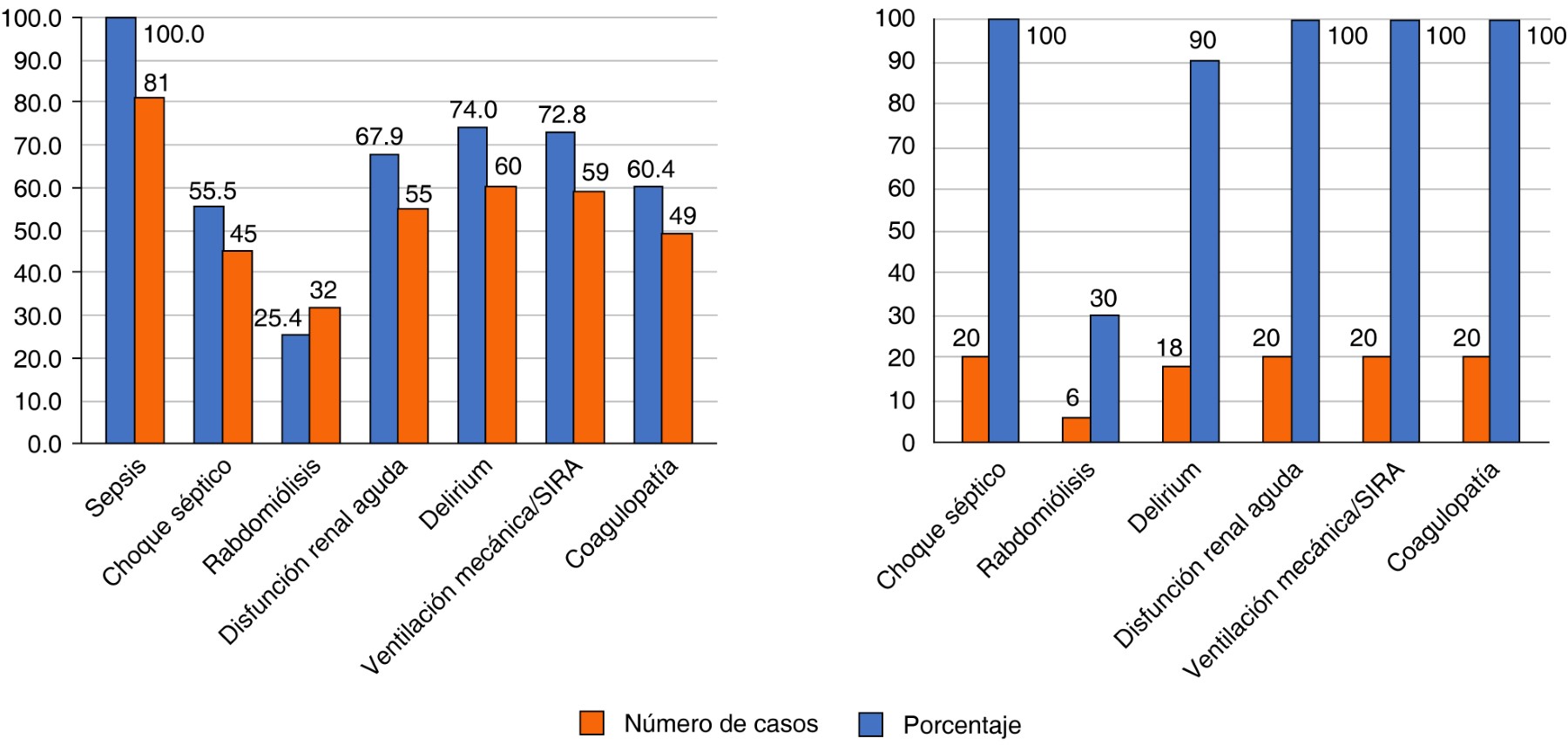 En el grupo de no sobrevivientes el promedio de edad fue de 49.5 ± 17.3 años, con ABSI de 11.03 ± 1.9 y días de estancia de 15.2 ± 15.9 días. Las complicaciones observadas con más frecuencia en este grupo fueron choque séptico, disfunción renal aguda, SIRA con necesidad de ventilación mecánica y coagulopatía, todas en 100% seguidas de delirium en 90% y rabdomiólisis en 30% (Figura 1).