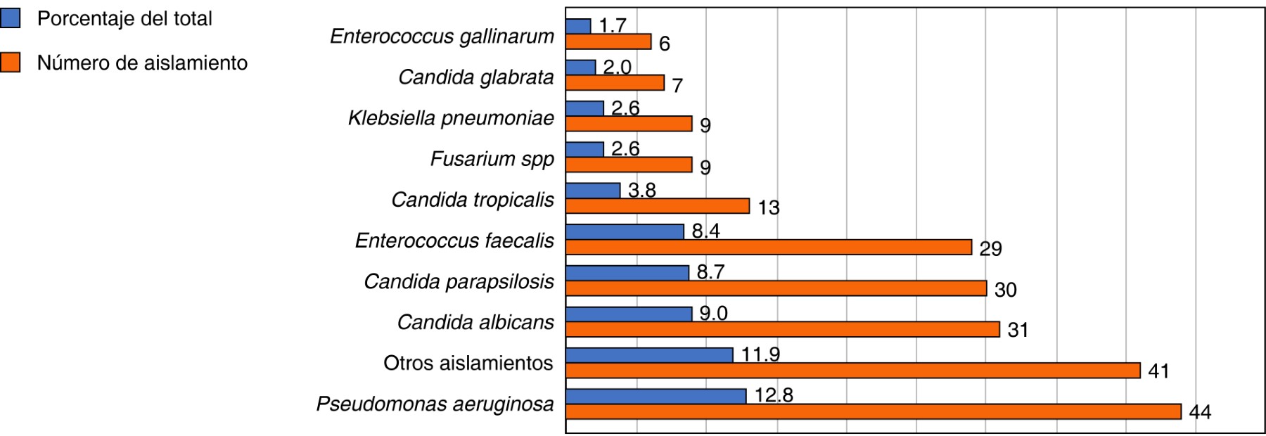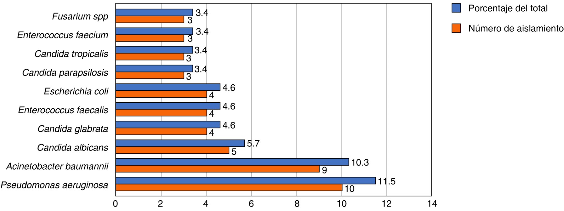 Las principales causas de infección de manera global fueron por Acinetobacter baumannii, Pseudomonas aeruginosa y diferentes especies de Candida. En el grupo de sobrevivientes los principales aislamientos microbiológicos fueron por Pseudomonas aeruginosa en 12.8%, Candida albicans en 9% y Enterococcus faecalis en 8.4%. La suma de todos los asilamientos de las diferentes especies de Candida muestra que es el organismo más frecuente en 23.4% de los casos (Figura 2).