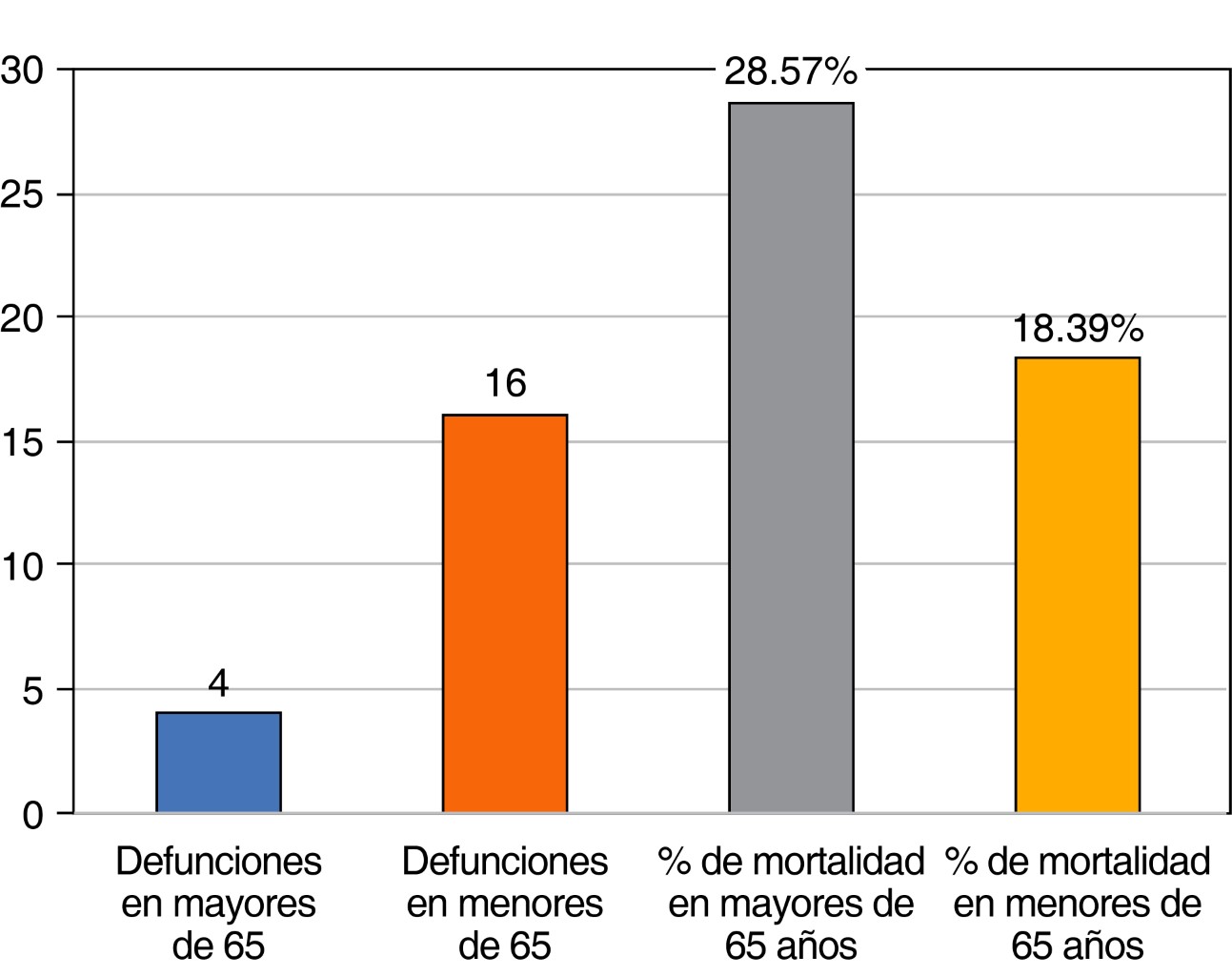 Las principales complicaciones que se presentaron en el grupo de sobrevivientes fueron sepsis en 100%, SIRA 72.8%, delirium 74% y disfunción renal aguda en 67.9%. La mortalidad global fue de 19.8%, en el grupo de mayores de 65 años la tasa de mortalidad fue de 28.5 versus 18.39% del grupo de menores de 65 años. La principal causa de muerte fue el choque séptico seguida de la disfunción renal aguda, SIRA y coagulopatía (Figura 4).