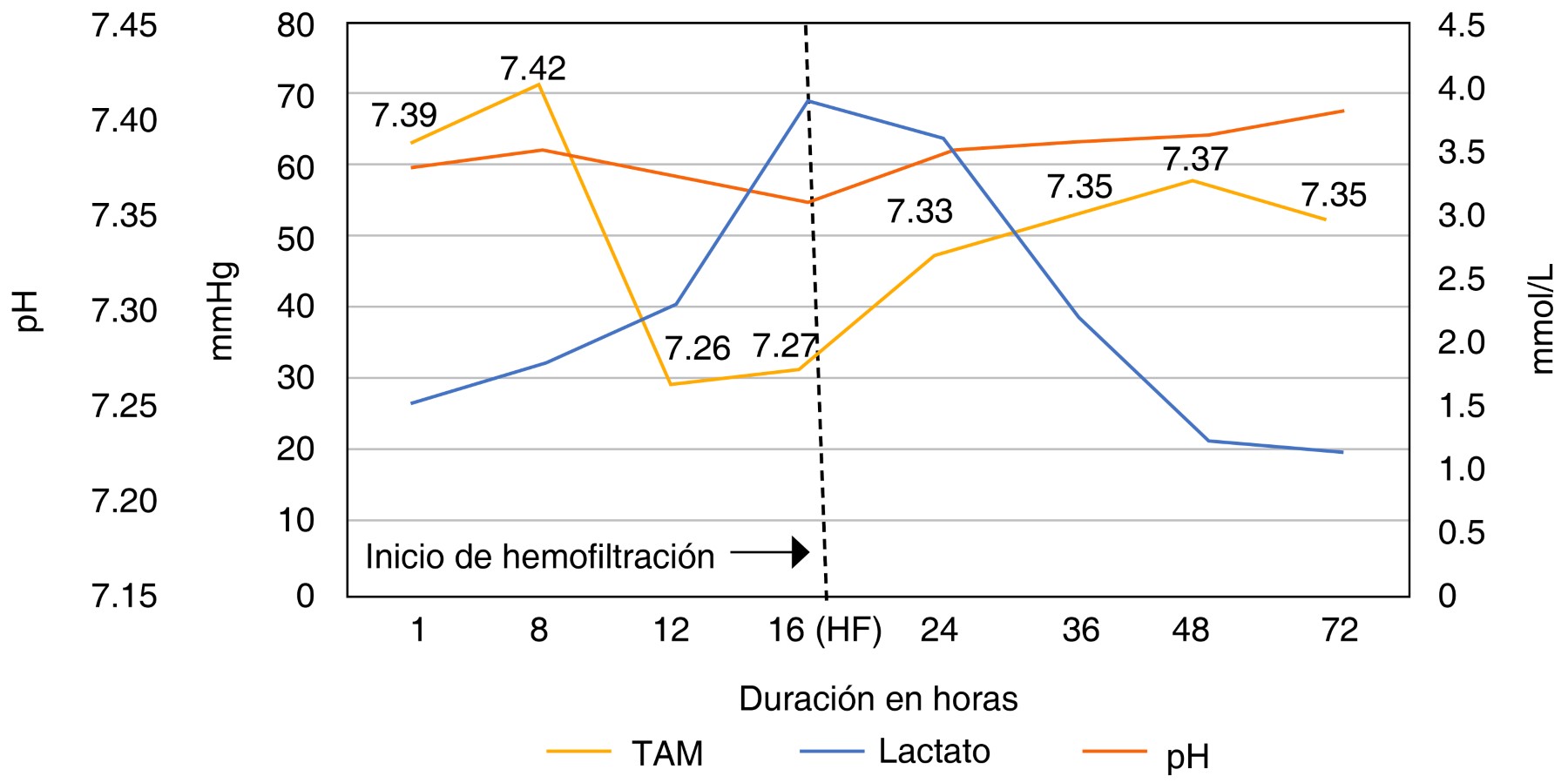 Al término del procedimiento, la paciente se trasladó a la Unidad de Cuidados Intensivos en una habitación con presión negativa, donde se mantuvo con dosis repetidas de aceite de oliva por sonda orogástrica cada cuatro horas. Aproximadamente a las nueve horas desde su ingreso, desarrolló acidosis metabólica, hiperlactatemia e hipotensión sostenida que requirió la administración de bicarbonato de sodio y vasopresores (Figura 1), donde obtuvo un puntaje de 10 en la escala APACHE II, para una mortalidad esperada de 11.3%. Pese al tratamiento con bicarbonato de sodio y norepinefrina, la paciente persistió con acidosis metabólica (pH 7.27, HCO3 16), hipotensión arterial (TAM 55 mmHg) e hiperlactatemia (4 mmol/L), por lo que se inició hemofiltración veno-venosa continua a las 16 horas de ingreso, a partir de lo cual se observó mejoría paulatina en los tres parámetros comentados. El tratamiento se mantuvo por 56 horas sin que se presentara alguna recaída posterior a su suspensión. La paciente fue extubada a las 24 horas de su ingreso y posteriormente egresada luego de cumplir cinco días de hospitalización para continuar con tratamiento psiquiátrico.
