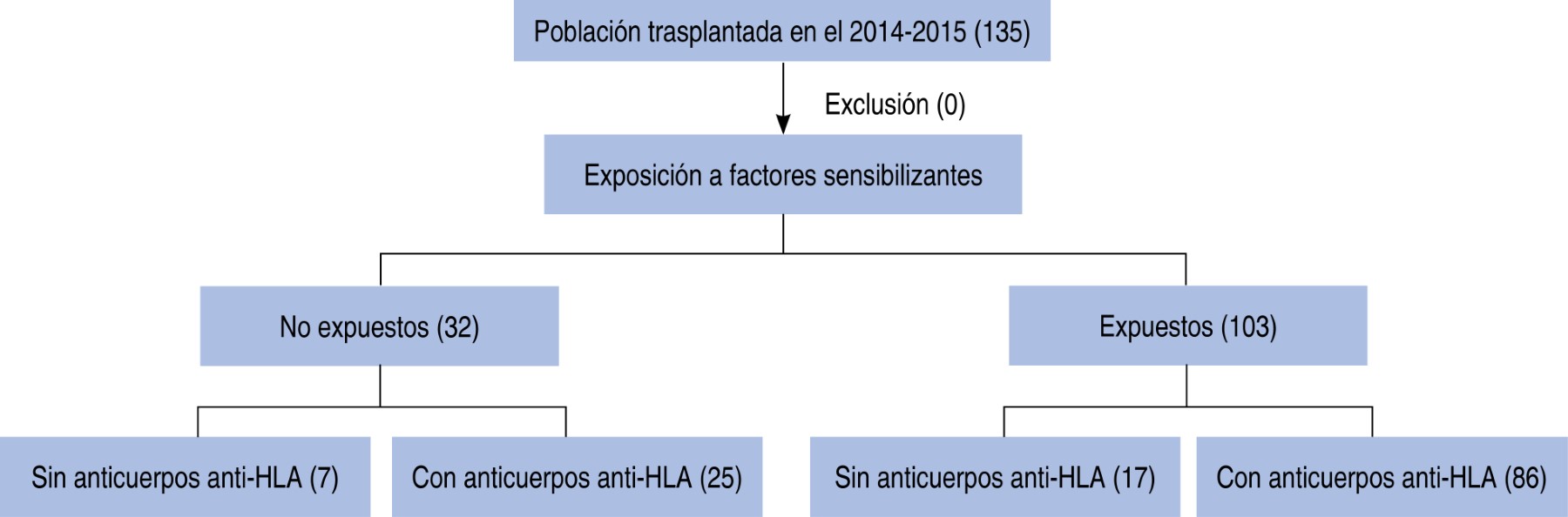 Del total de la población trasplantada en 2014 y 2015, que fueron 135 pacientes, ninguno fue excluido; posteriormente, se analizó la base de datos del laboratorio de trasplante para obtener la exposición a factores sensibilizantes y el estatus de Ac HLA pretrasplante. Se formaron cuatro subgrupos: siete pacientes sin exposición a factores sensibilizantes y sin Ac HLA; 25 pacientes sin exposición a factores sensibilizantes y con Ac HLA; 17 pacientes con exposición a factores sensibilizantes y sin Ac HLA; y por último, 86 pacientes expuestos a factores sensibilizantes y con Ac HLA (Figura 1).