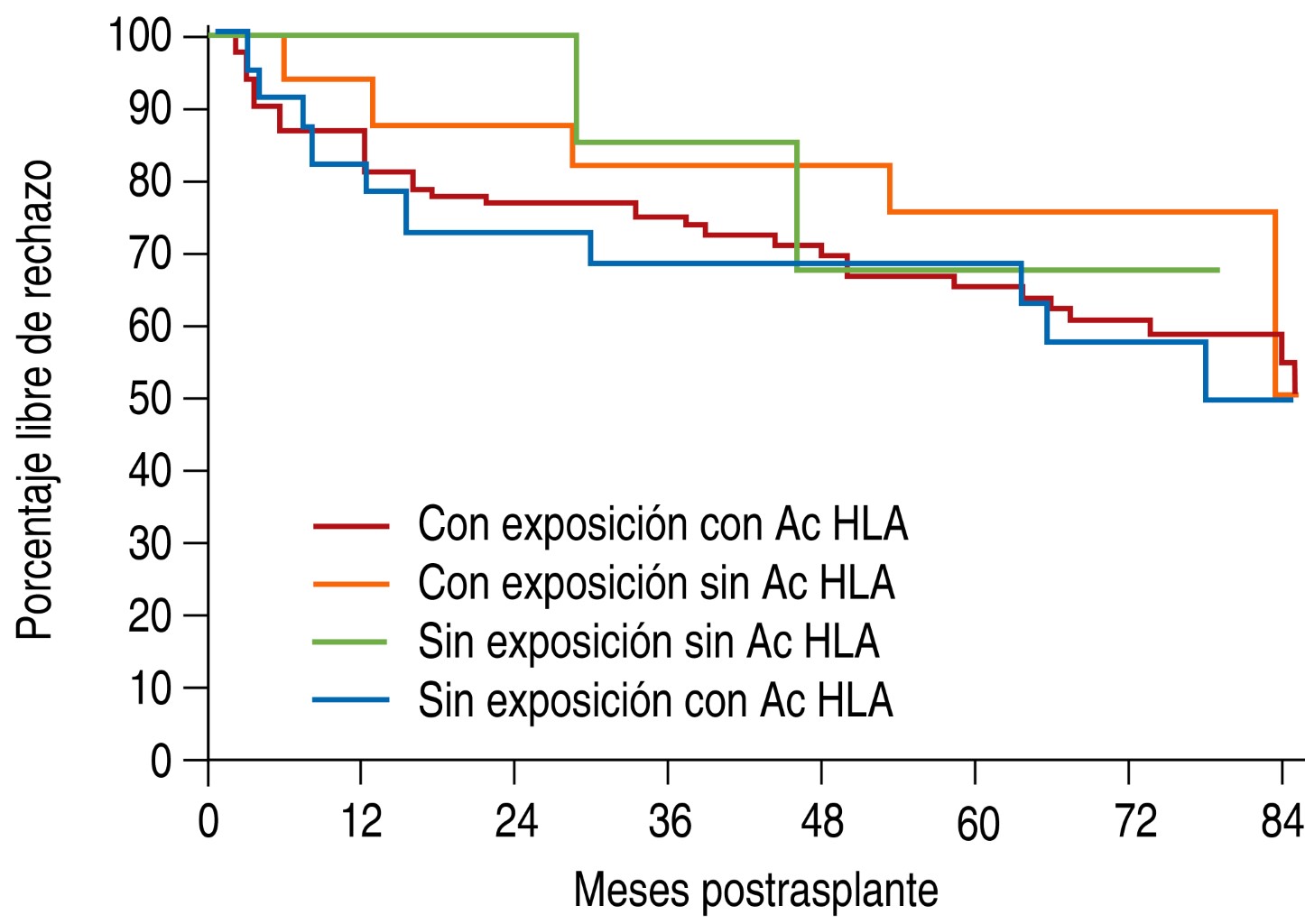 Sin embargo, la presencia de Ac HLA no dirigidos al donante aún sin antecedente de exposición previa, pueden denotar una mayor capacidad de respuesta inmune (mayor riesgo) y, por otro lado, la ausencia de anticuerpos, incluso a pesar de exposición a factores sensibilizantes, pudiera denotar un menor riesgo. Por lo anterior, el estudio y un mejor entendimiento de los grupos de riesgo, nos ayudaría a una mejor comprensión y nos daría las directrices del manejo de la inmunosupresión a largo plazo.