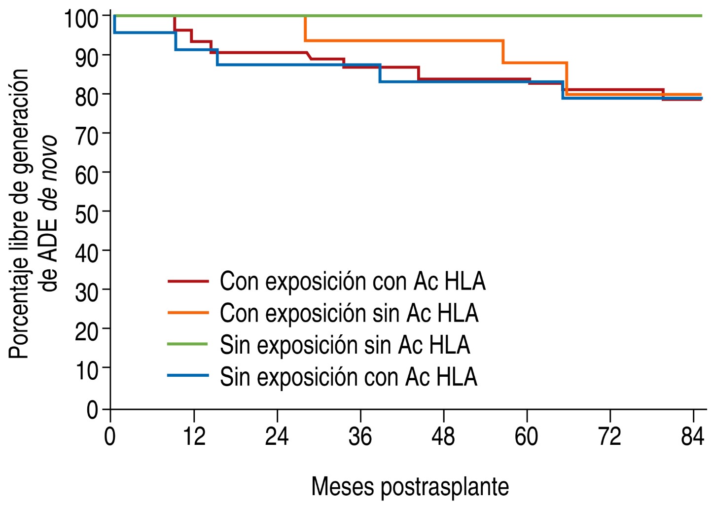 La generación de ADE de novo postrasplante se asoció con 47% de RAMA en los pacientes expuestos a factores sensibilizantes y 46% de los pacientes sin exposición, mucho más altos que en los pacientes con ADE pretrasplante. Dentro de la cinética de ADE postrasplante nos muestra una clara elevación a partir del tercer año, estos ADE son responsables de más de 50% de los RAMA de los grupos expuestos a factores sensibilizantes, y 48% en los grupos expuestos, lo que nos mostraría claramente la importancia de los ADE postrasplante y el impacto negativo sobre el injerto renal, además de recalcarnos la utilidad de su monitorización pre y postrasplante.3