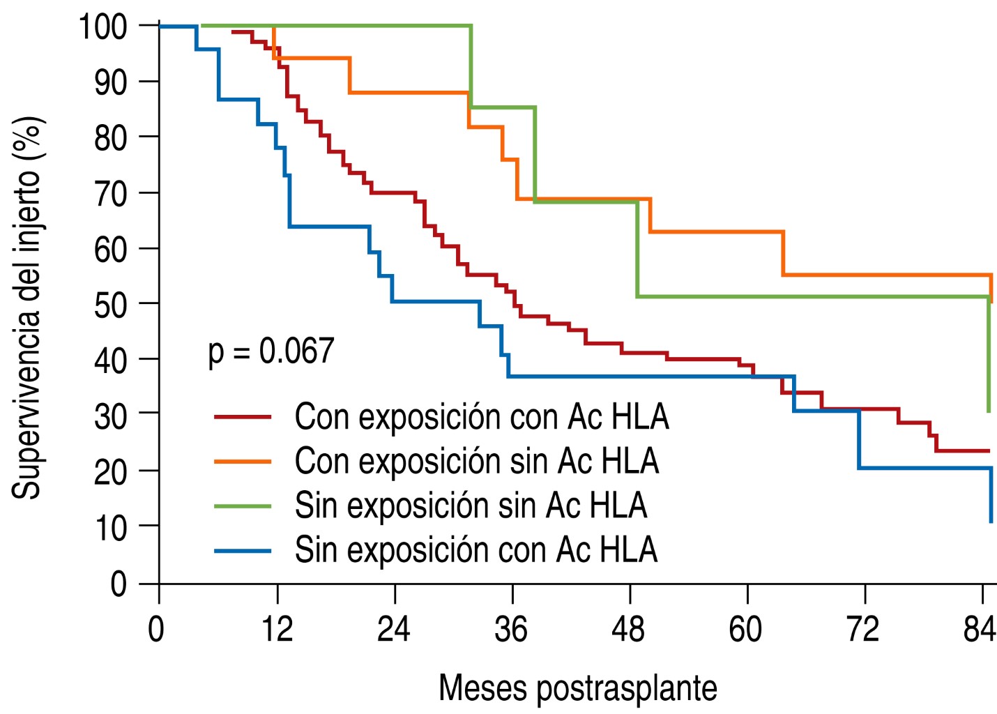 Podemos señalar que 37 y 36% con estatus de Ac HLA pretrasplante con y sin exposición a factores sensibilizantes, respectivamente, desarrollaron RAMA a lo largo de cinco y seis años postrasplante; además, mostraron afectación en la supervivencia del injerto; si bien, al momento de compararlos entre grupos, no existió significancia estadística (p = 0.067) se evidencia una tendencia a menor supervivencia en estos grupos.