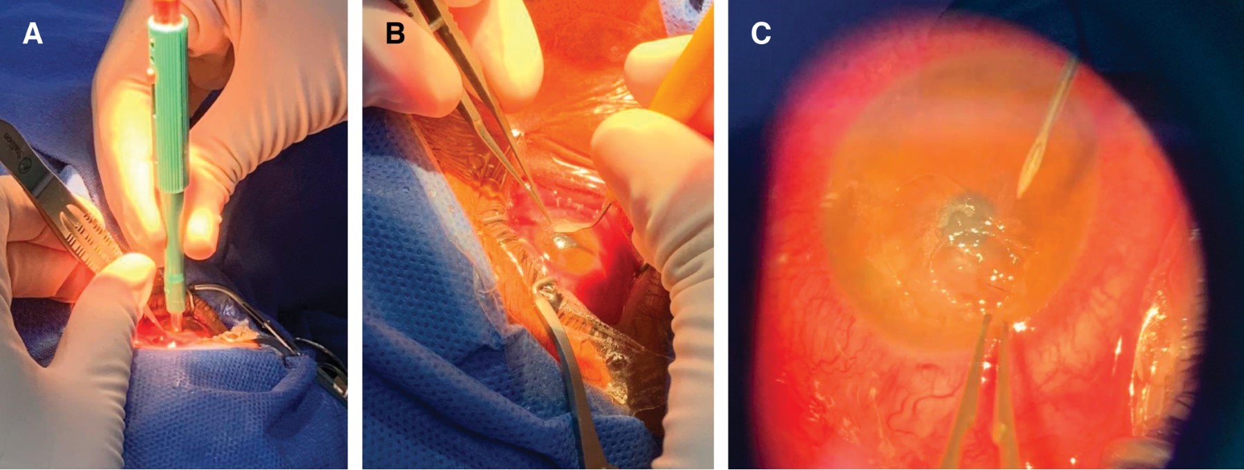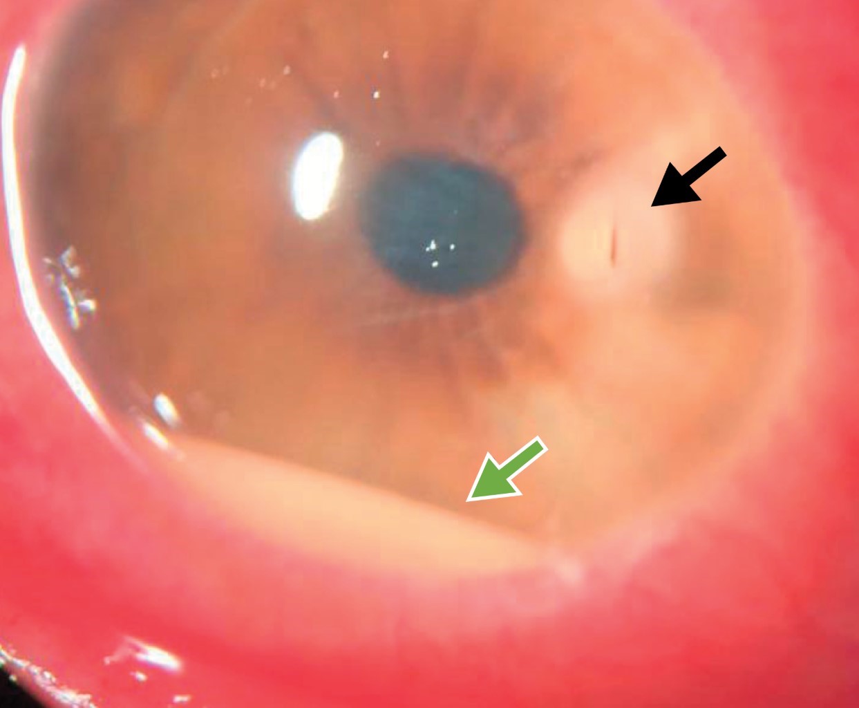 La reparación del defecto corneal secundario se realizó mediante un miniinjerto de tejido corneal de donador cadavérico fresco, lamelar anterior profundo excéntrico de 3 mm.