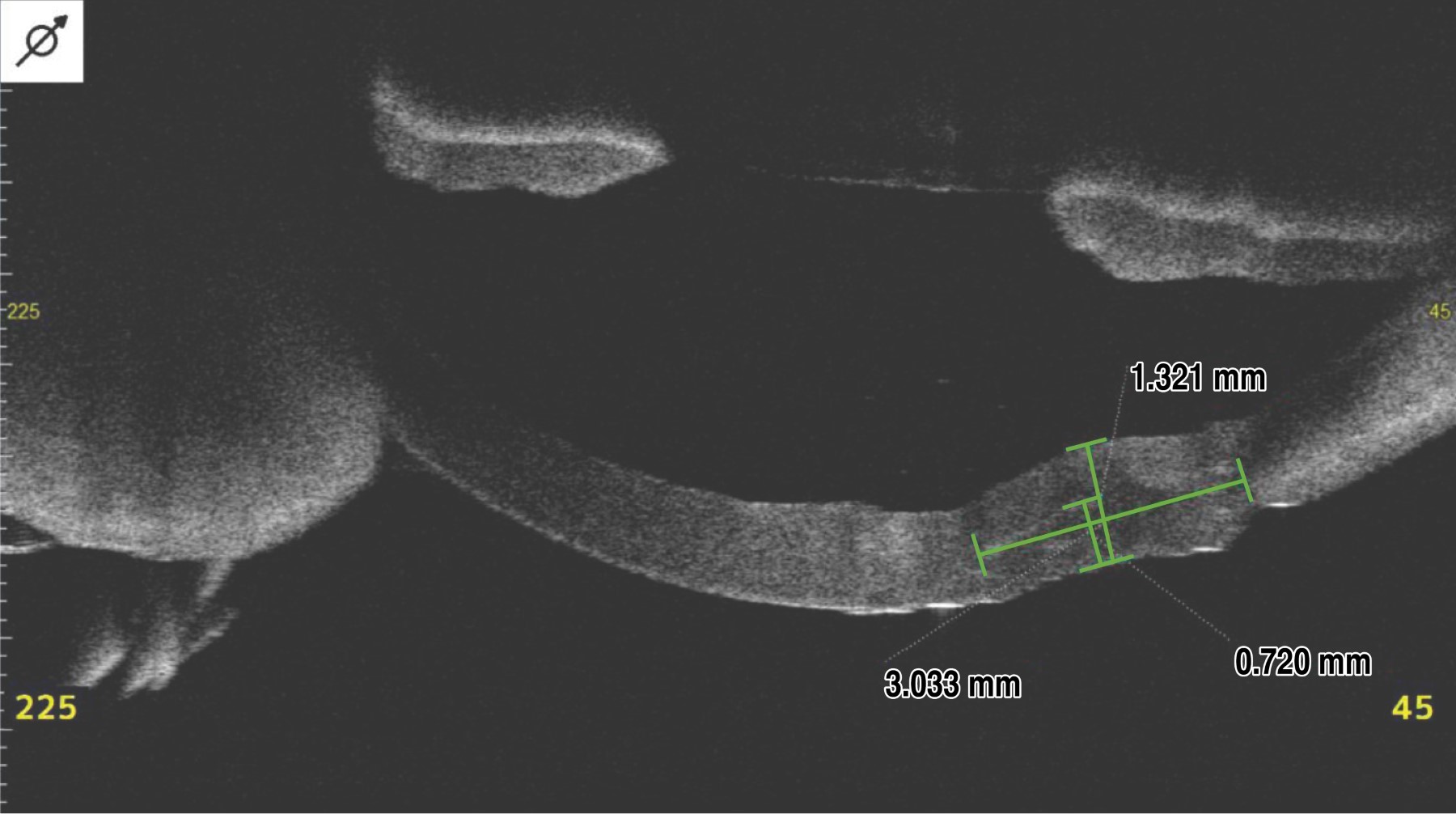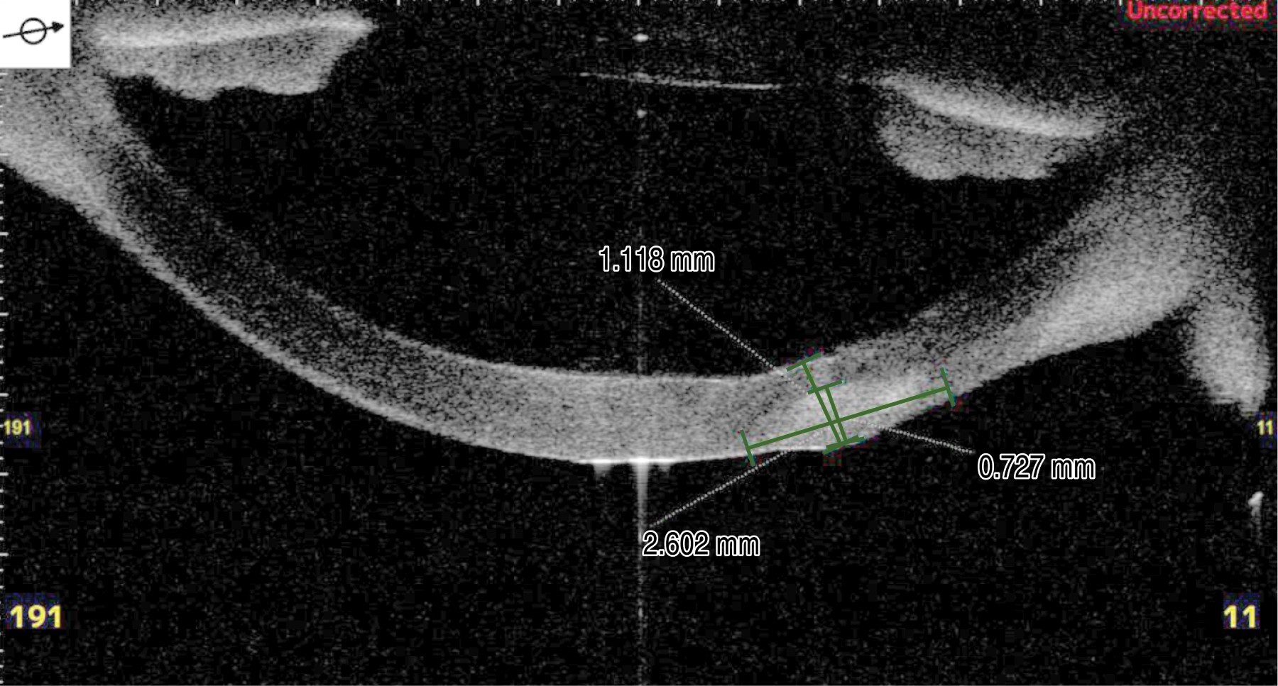Se realizó tomografía de coherencia óptica de córnea (OCT, por sus siglas en inglés) del segmento anterior donde se identificó cuerpo extraño corneal en estroma profundo, con un grosor corneal total de 1.11 mm y de área afectada una profundidad de 0.727 mm con necrosis activa de 2.6 mm de diámetro (Figura 2).