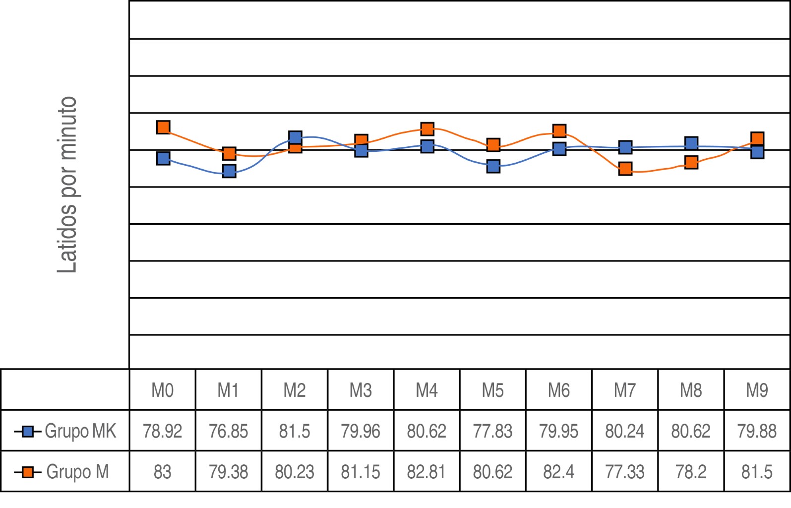 En el grupo M, el comportamiento de FC fue superior en el momento M0 con 83.00 ± 5.60 latidos por minutos y posteriormente se mantiene con valores semejantes, los cuales resultan ser ligeramente superiores con respecto al grupo MK. No se encontraron diferencias significativas en t de Student, grupo M χ2 = 98.3, p = 0.068; grupo MK χ2 = 112.1, p = 0.152.