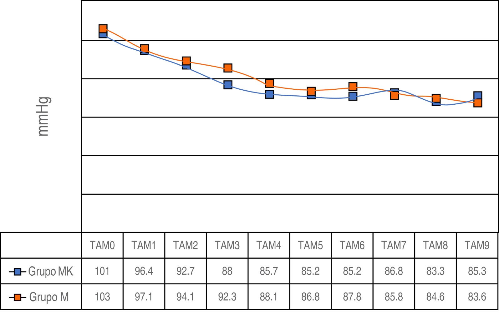 El análisis del comportamiento de la TAM para el grupo MK tuvo su valor más alto en el momento M0 (101.0 ± 4.8 mmHg). Posteriormente se produjo un descenso hasta el momento M9, donde alcanzó 85.3 ± 6.7 mmHg. No se observaron diferencias altamente significativas para los diferentes tiempos estudiados en esta variable (χ2 = 130.1, p = 0.067). En el grupo M, también se observó el valor más elevado en el momento M0 (103.0 ± 5.4 mmHg) para después descender hasta el momento M9 con un valor de 83.6.6 ± 5.3 mmHg sin que se reporten diferencias significativas (χ2 = 17.3, p = 0.074).